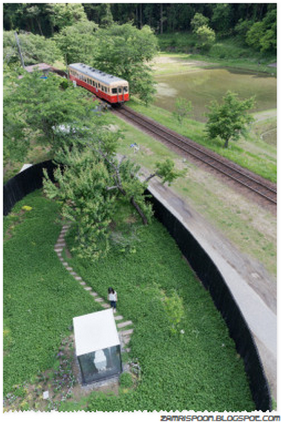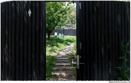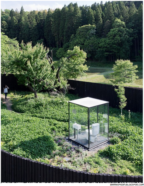 Toliet itu diselesaikan pada 2012 oleh arkitek Sou Fujimoto, sebuah WC umum yang dibungkus kotak kaca telus, di tengah-tangah taman rimbun yang menduduki kawasan seluas 200 meter persegi. Luas area itu bahkan lebih luasa daripada stesen kereta itu sendiri.
