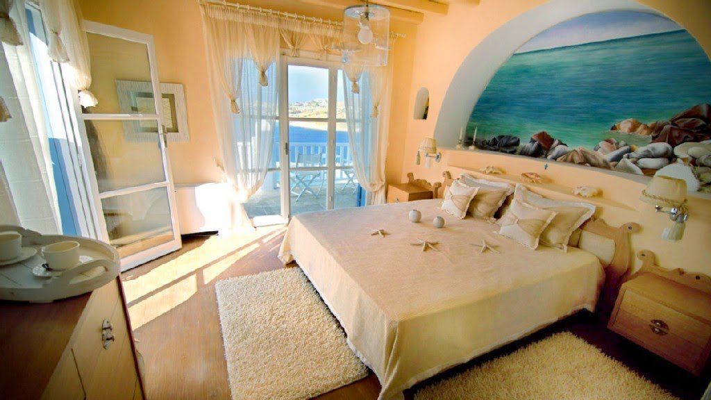 The design of this villa follows strict Cycladic aesthetics, characterized by white-washed walls and deep blue arches, while it is enhanced with wall painting inside and outside illustrating a unique touch of myconian art.