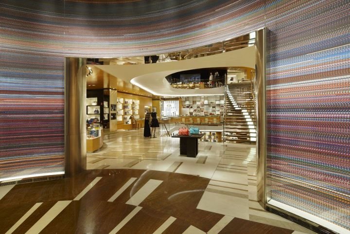 Peter Marino, the new york-based architect responsible for Louis Vuitton store interiors across the planet, redesigned the buiding’s interior, retaining the visual drama by its impressive staircase winding around a wide open atrium that allows in floods of daylight.