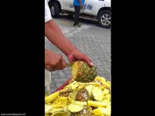 Orang dalam video ini mengupas buah nanas dengan cara yang luar biasa. Awalnya admin tidak begitu yakin dengan apa yang dilakukan lelaki pengupas nanas itu kerana tidak ada satu keping kulit pun yang lepas dari buah nanas itu kecuali pada bahagian pangkal dan atas buah.