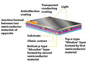 The process the scientists at Argonne discovered makes cement into a semi-conductor. If you’re like me, you might ask “What does this mean?” and “How soon will I be able to take a transporter to and from work?” Well (unfortunately for us) there’s no transporter applications yet. However, you’re going to see it show up in your consumer electronics as thin films, protective coatings, and in the manufacture of computer chips. Here’s a diagram of how thin films work in solar cells so you can better understand how your “cement” is going to look in the very near future: