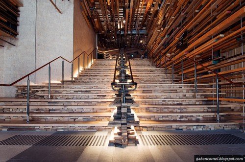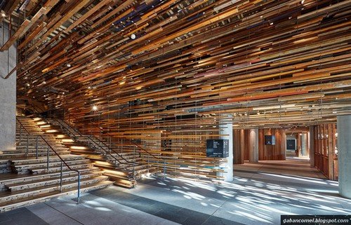 Pereka bentuk bangunan itu, March Studio berkata, pihaknya menggunakan kira-kira 5,000 kepingan kayu kitar semula untuk menghiasi pintu masuk lobi tersebut selain menjadikannya sebagai dinding, tangga dan perabot.