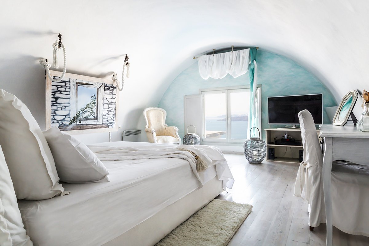 On the upper floor is the Master’s bedroom with wooden floor, vaulted ceiling and a massive king size bed. You could even watch the sea from your bed through the window in front of you. All the above combined with art objects, paintings and an art deco arm chair create an atmospheric theater setting in this bedroom.