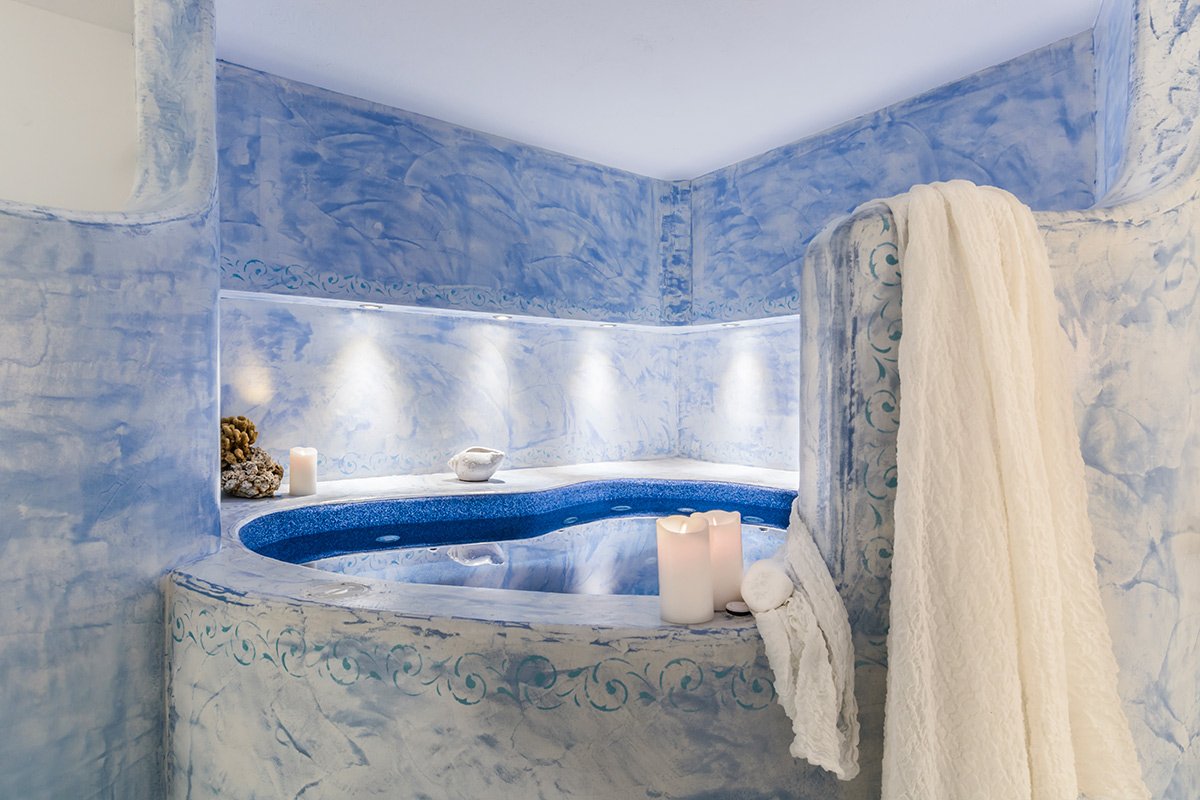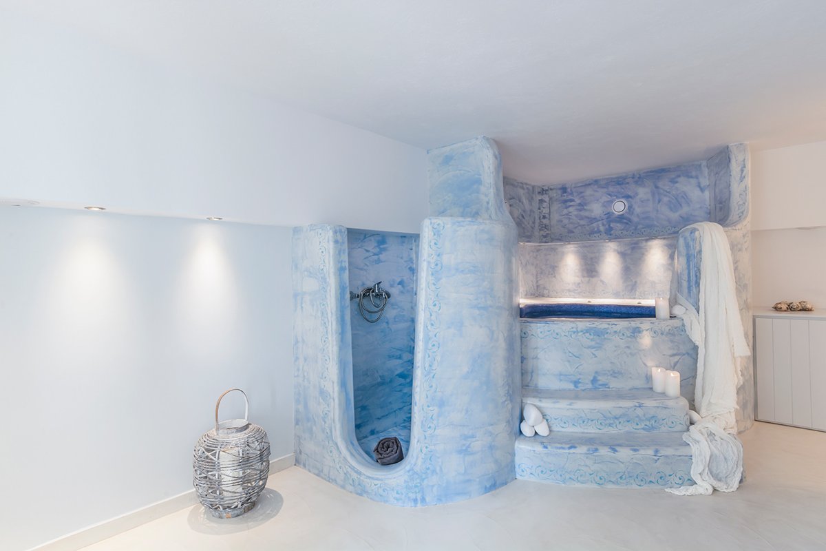 The house has a private courtyard with flowers, private infinity pool, fantastic sea views, a shaded lounge area under a pergola and sun beds. The lounge area is atmospheric especially in the night when it is candle lighted and you enjoy unlimited views from every corner of it. Stairs lead us to a large terrace on the upper floor that is equipped with a lounge area with views. On the back of the house there is a BBQ area, a wooden oven and a large wooden dining table overlooking the old Castle of Akrotiri.