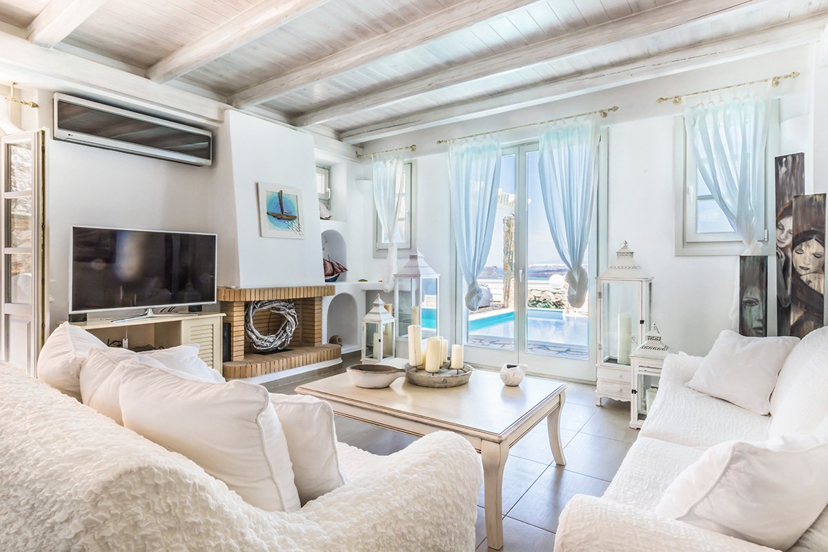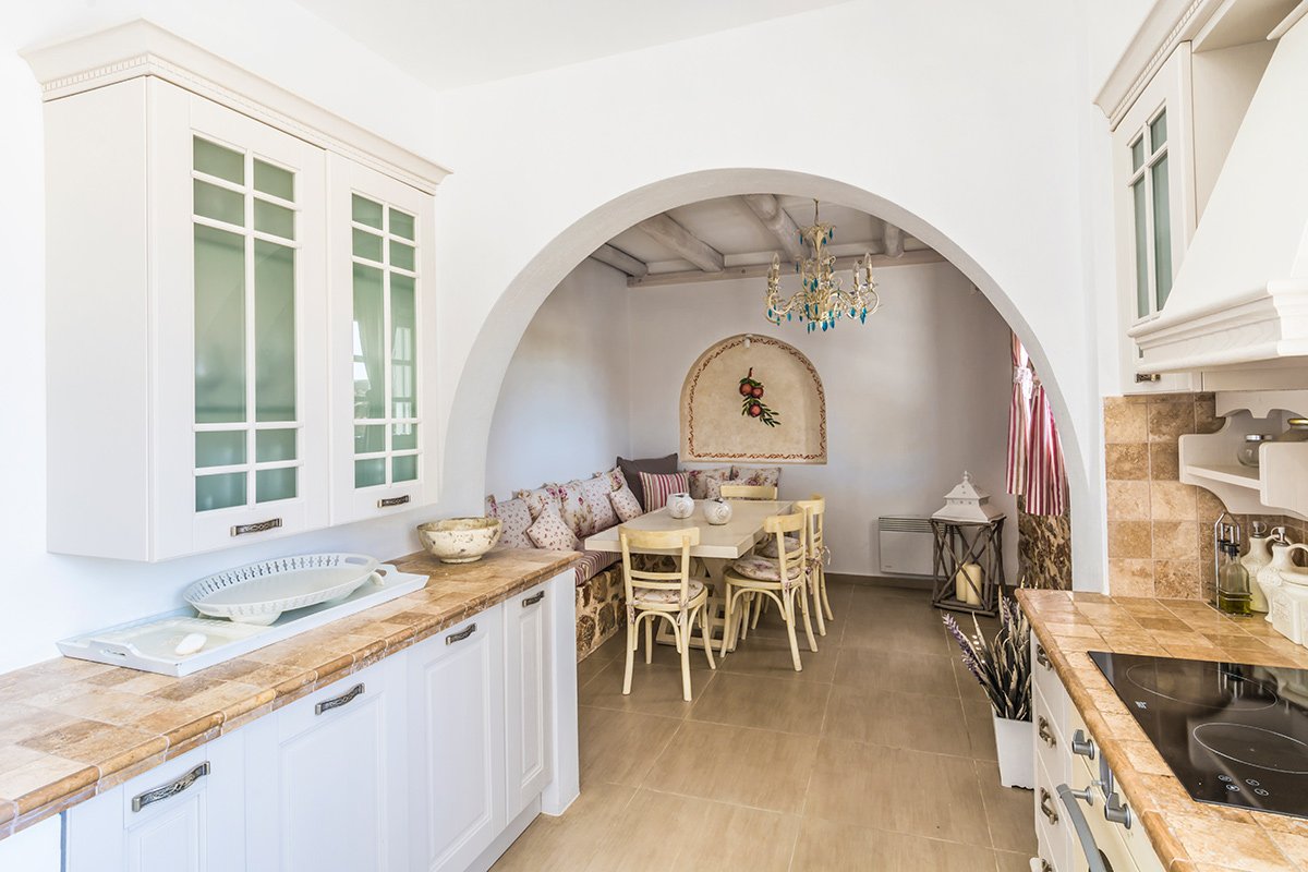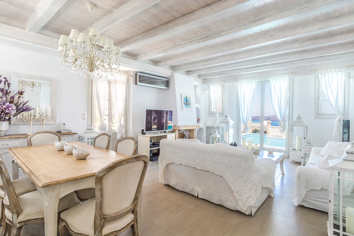 As you enter from the main door to the living area the beauty reveals in front of your eyes. Colorful paintings, art objects, elegant furnishing, painted walls, wooden ceiling, fire place and stunning views, all in harmony that give the villa a very warm and playful character. You enjoy every moment being in this welcoming environment.