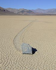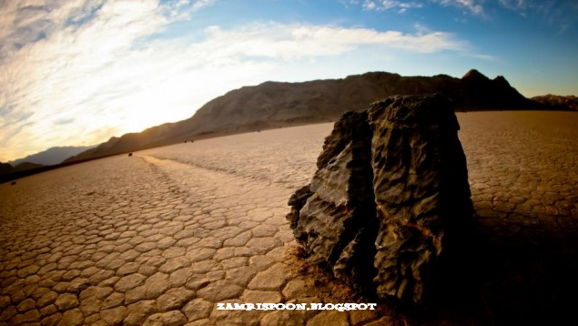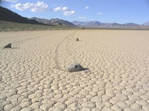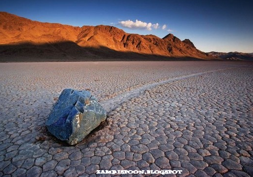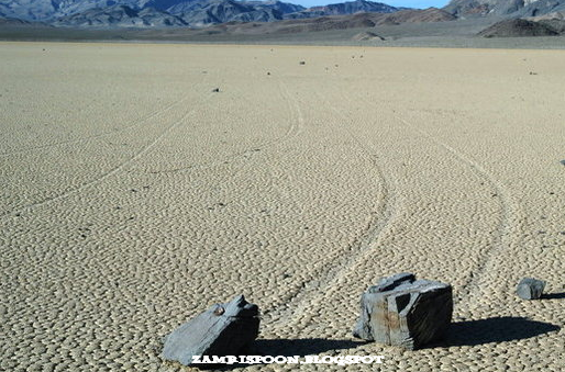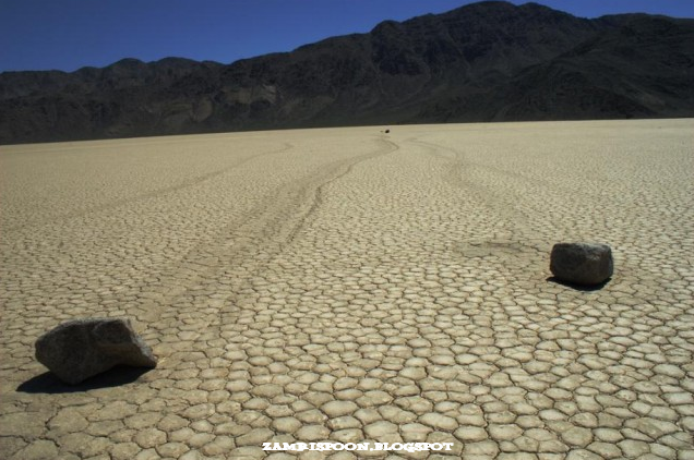 Batu-batu misteri itu tersebar di Racetrack Playa, Death Valley, California. Sebuah jejak berpola zig–zag merupakan sebuah bukti bahawa batu ini telah berpindah sejauh 250 meter hanya dalam satu kali musim sejuk saja. Ada sekitar 150 batu besar seperti itu namun tak seorang pun pernah melihat batu-batu itu bergerak.