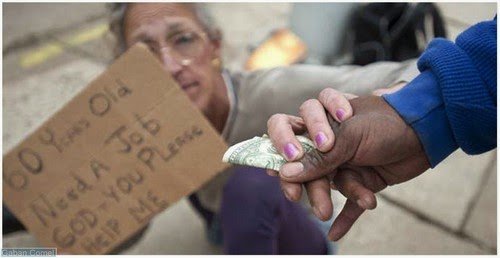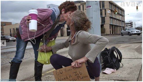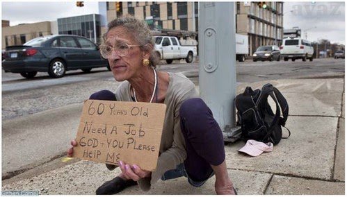 Sementara tubuhnya terlipat , di lehernya terjuntai papan bertuliskan : ” 60 tahun , mencari pekerjaan , Tuhan , dan anda . Tolong bantu saya ” .
