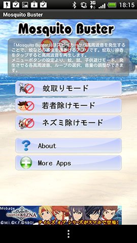 Aplikasi yang konon katanya ampuh untuk mengusir nyamuk ini bernama ‘Mosquito Buster’. Tersedia untuk sistem iOS maupun Android. Bagaimana caranya bekerja? Menurut pengembangnya, aplikasi ini bekerja dengan memancarkan gelombang suara yang dibenci oleh nyamuk. Kelihatannya memang metode yang sederhana, tapi jika percobaan yang dilakukan oleh TABROID (situs Jepang yang kegiatannya me-review aplikasi berbasis Android) ini benar, maka aplikasi ini bisa dibilang seampuh alat ajaib doraemon.