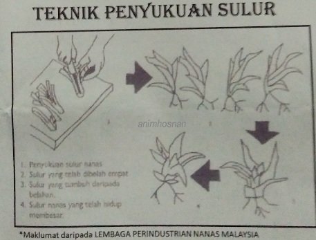 BENIH NENAS (Ananas comosus) merupakan input asas penting dalam usaha untuk menanam nenas selain daripada keperluan input lain seperti baja, racun dan sebagainya. Benih nenas boleh didapati secara umumnya daripada Sulur Tanah (ground suckers), Sulur Udara (Aerial Suckers), Sulur Tangkai dan juga bahagian Jambul nenas (Crown). Beberapa teknik aruhan dilakukan untuk menghasilkan benih nenas seperti menggunakan bahan Cyclnillidae (pada kadar 1.6 liter sehektar (Martinez. LR, 2005) dan penggunaan bahan Chloroflurenol (pada kadar 3,750 liter sehektar). Penulis blog dapati bahan tanaman nenas daripada sulur tanah merupakan sumber benih tanaman nenas yang paling selalu digunakan kerana ianya mudah didapati, murah dan mudah untuk ianya dikendalikan. Terkini adalah benih nenas yang disediakan dimakmal iaitu Benih Kultur Tisu (tissue culture). Benih kultur tisu bagaimana pun belum disyorkan (not yet recomended) oleh Jabatan Pertanian dan LPNM untuk ianya digunakan kerana masaalah variasi Somaclonal. Variasi somaclonal adalah dimana pokok nenas yang tumbuh akan ada sedikit perbezaan sekitar 10 – 30% daripada ciri-ciri pokok induk. Teknik lain dalam menyediakan benih nenas adalah dengan melalui kaedah pembiakan dinurseri melalui Kaedah PENYUKUAN SULUR, Kaedah BELAHAN BATANG TUNGGUL NENAS dan juga Kaedah PEMOTONGAN MATA TUNAS DAUN (Leaflet bud cuttings). Pada masa rencana ini ditulis bekaln benih nenas terutama untuk varieti MD2 sangat berkurangan akibat ramai petani telah berminat dengan nenas ini yang mendapat harga baik dipasaran. Nenas MD2 merupakan jenis nenas premium dimana ia ada permintaan benih nenas mencecah jutaan benih dalam masa setahun sedangkan bekalan benihnya tidak mencukupi. Benin nernas MD2 pernah dijual doantara RM2.00 – RM2.50 satu sulur masa ini iaitu ketika lebih ramai petani minat untuk menukar kepada nenas vareieti MD2. Artikel subuh ini saya menulis dalam “Anim Agro Technology” mengenai temuan teknologi penghasilan benih sulur nenas secara kaedah penyukuan jambul. Inovasi ini telah dilaksanakan oleh Jabatan Pertanian Negeri Kedah untuk nenas MD2.
