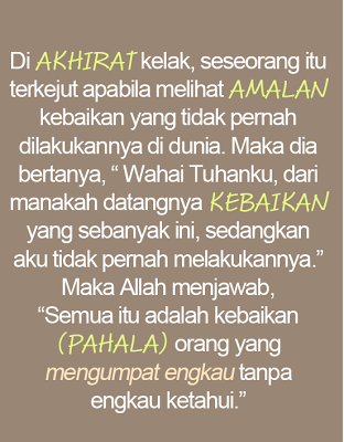 Diriwayatkan oleh Abu Ummah al-Bahili, di akhirat seorang terkejut besar apabila melihat catatan amalan kebaikan yang tidak pernah dilakukannya didunia. Maka, dia berkata kepada Allah “Wahai Tuhanku, dari manakah datangnya kebaikan yang banyak ini, sedangkan aku tidak pernah melakukannya” .