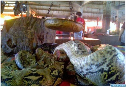 . Menurut para peniaga disitu ular sawa bersaiz raksasa sebesar pokok kelapa sering dijual di pasar itu. Khas untuk daging ular biasanya berharga Rp 50 ribu per kilogram. Daging ular yang terjual akan dibakar terlebih dahulu oleh penjual sebelum dibawa pulang pembeli untuk dimasak.