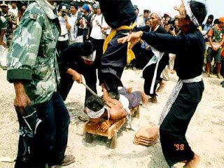 Ada banyak pertentangan di antara desa Asmat, yang paling mengerikan adalah cara yang dipakai suku asmat membunuh musuhnya, ketika musuh dibunuh, mayatnya dibawa ke kampung, kemudian dipotong dan dibagikan kepada seluruh penduduk untuk dimakan bersama, mereka menyanyikan lagu kematian dan memenggal kepalanya, otaknya dibunngkus daun sagu dan dipanggang kemudian dimakan