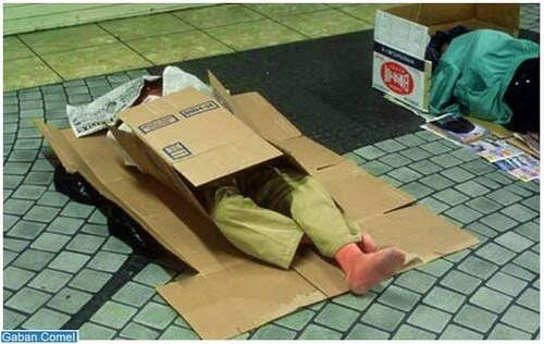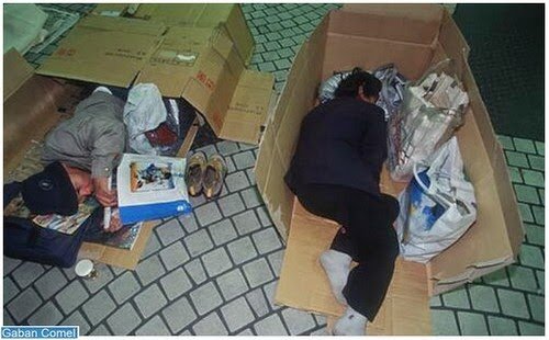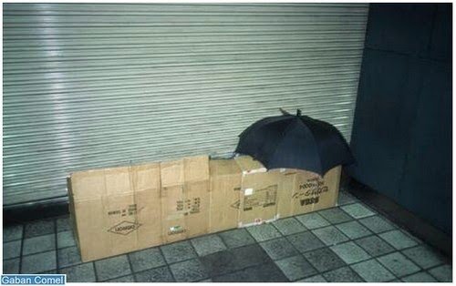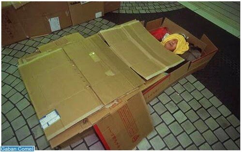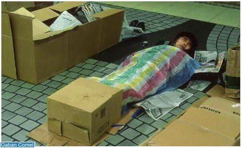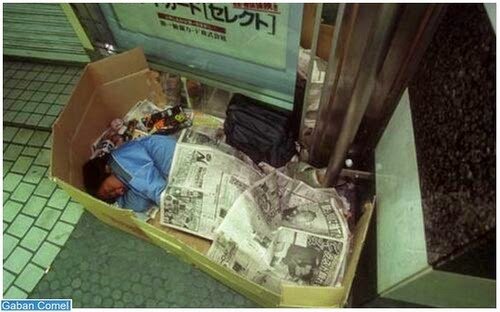 Walau bagaimanapun, tidak semuanya sempurna, dan juga di negara-negara seperti ketiadaan tempat tinggal bagi orang-orang geladangan. Demikian itu adalah kes orang-orang ini, yang tinggal dalam kotak di Stesen Shinjuku di Tokyo.