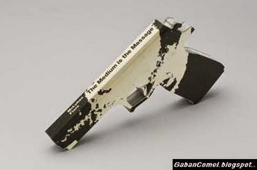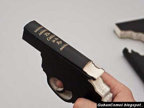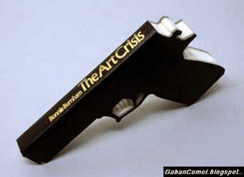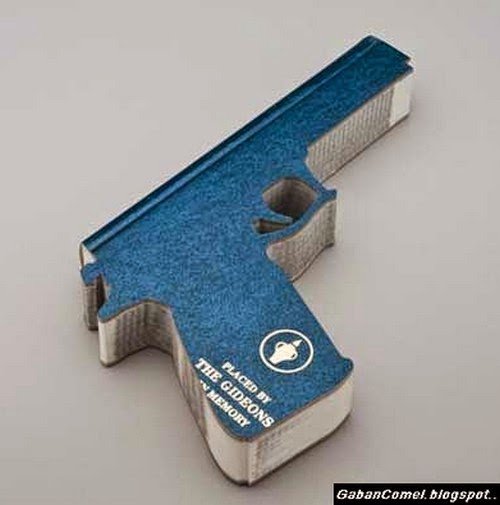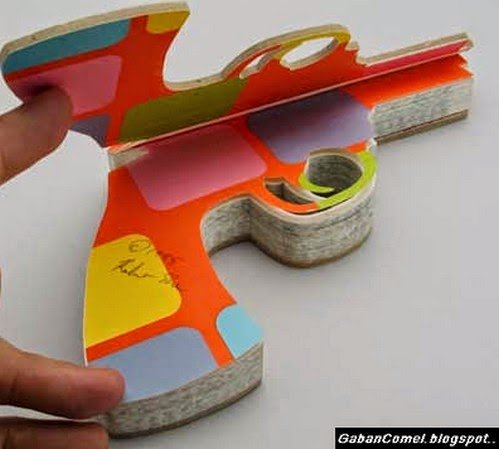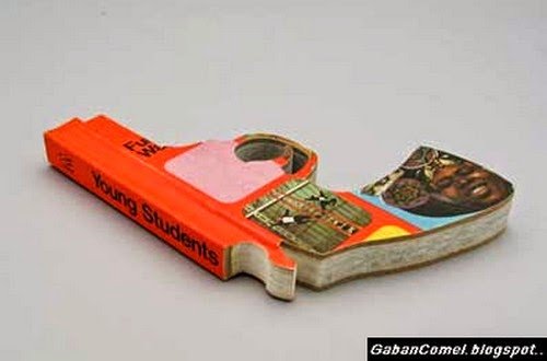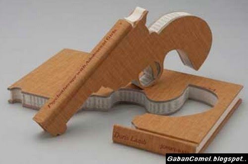 Ada-ada saja perkara yang dilakukan penerbit yang satu ini. Buku dicetak tidak dalam bentuk standard berupa kotak persegi panjang yang lazim kita lihat di pelbagai rak buku. Namun bentuknya malah seperti pistol, yang tentunya menarik dan unik. Inilah buku berbentuk unik  pistol di bawah ini:
