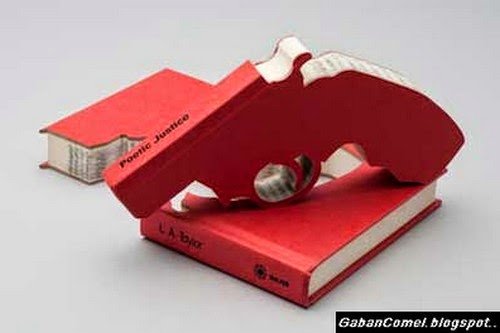 Ada-ada saja perkara yang dilakukan penerbit yang satu ini. Buku dicetak tidak dalam bentuk standard berupa kotak persegi panjang yang lazim kita lihat di pelbagai rak buku. Namun bentuknya malah seperti pistol, yang tentunya menarik dan unik. Inilah buku berbentuk unik  pistol di bawah ini: