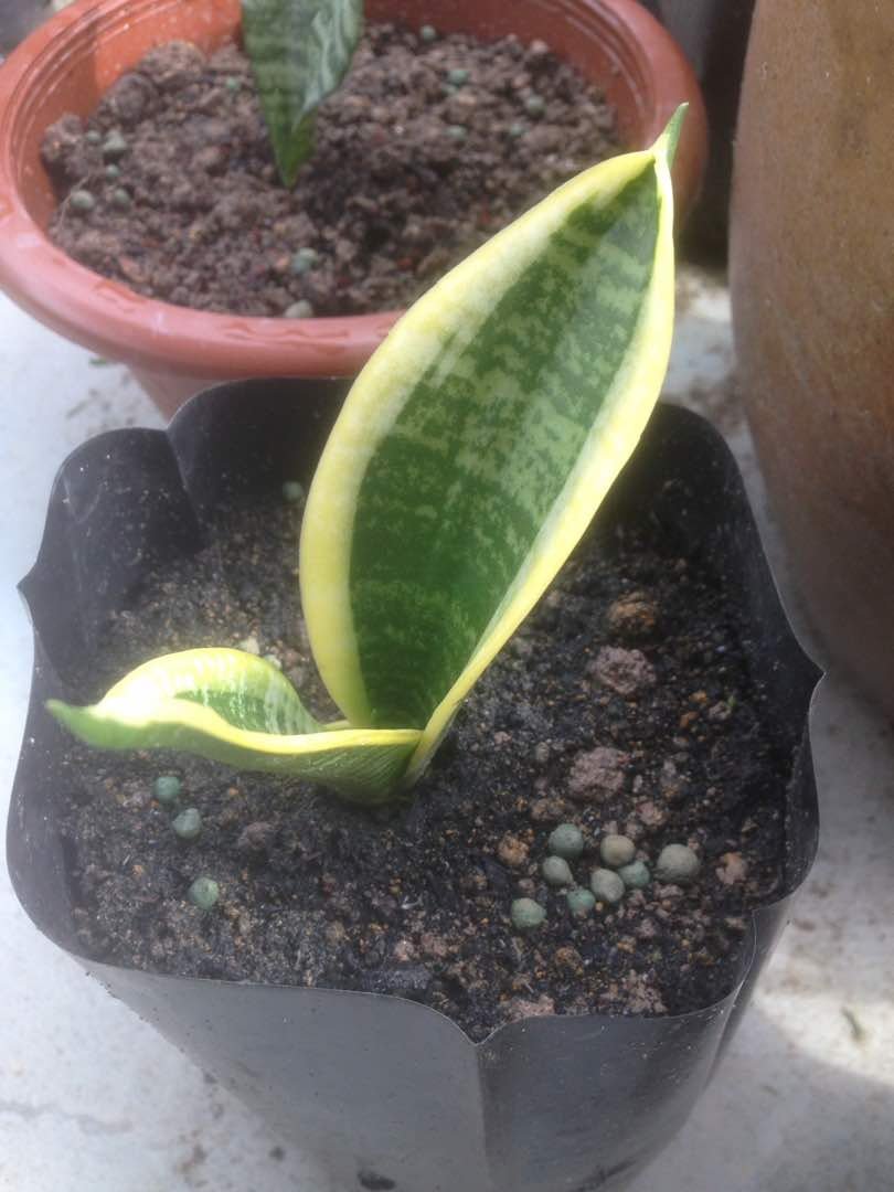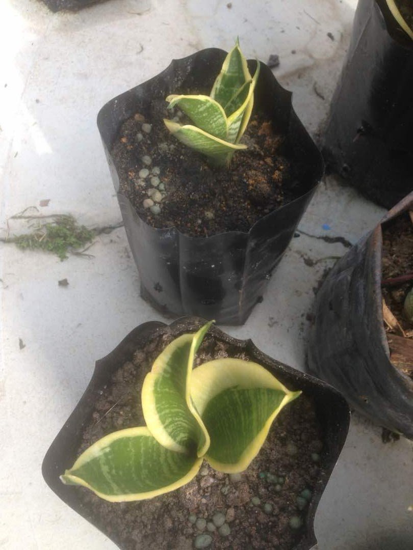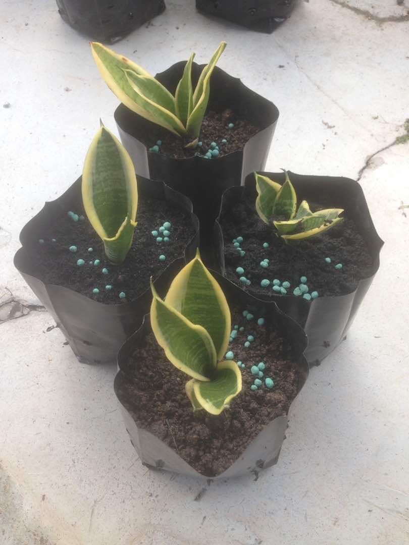 Empat pokok lidah mertua renek laurentii aka Sansevieria trifasciata dwarf laurentii telah dipindahkan ke beg poli