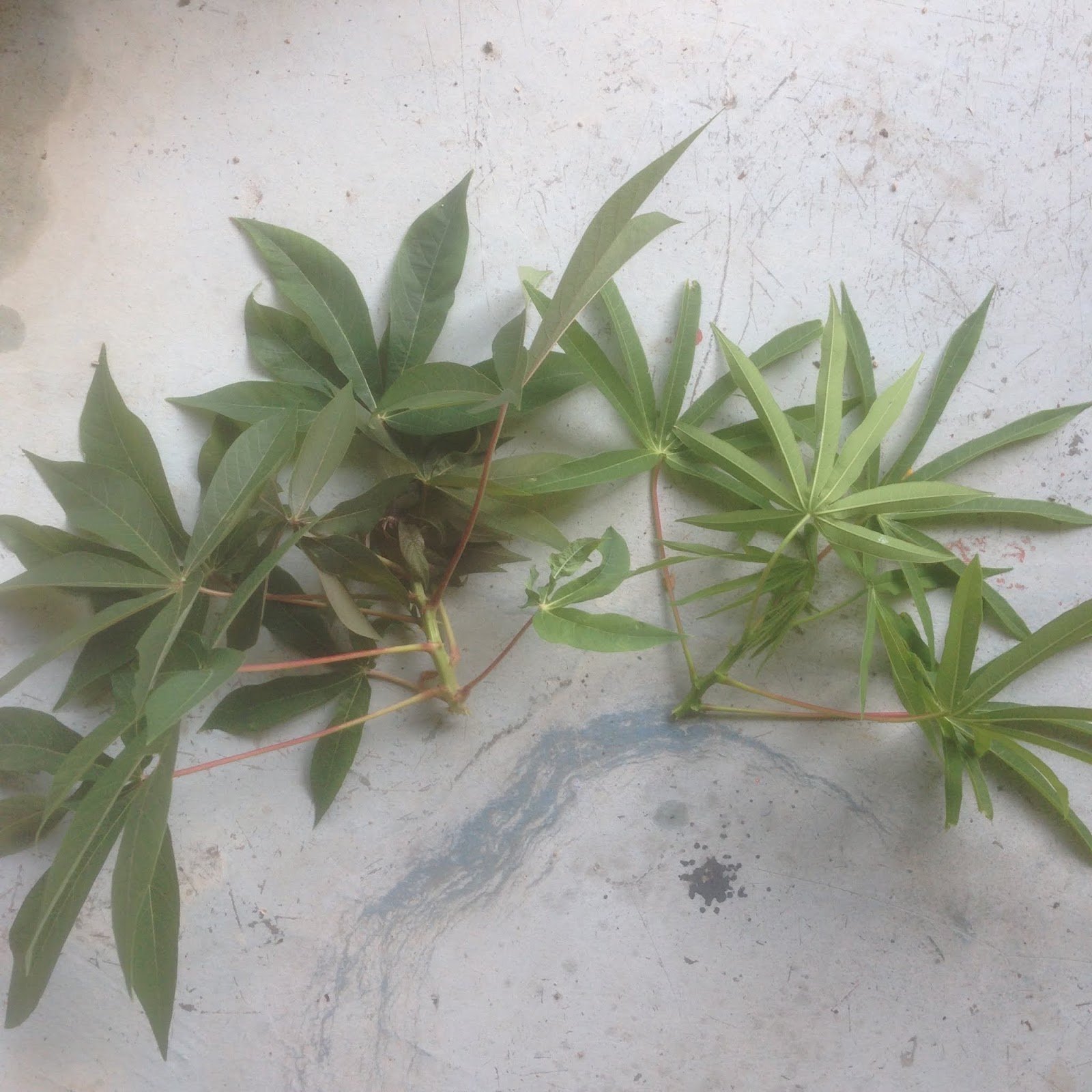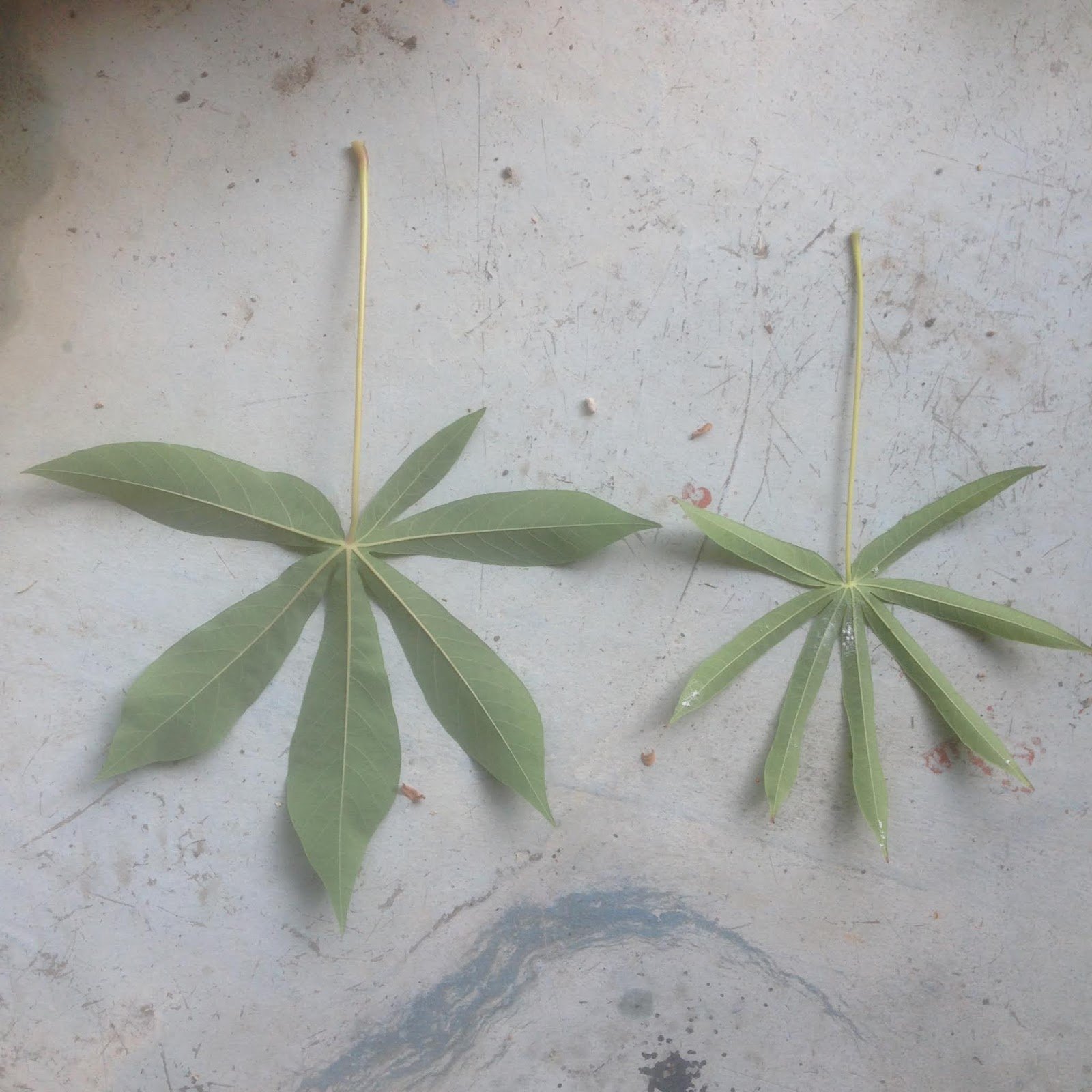Gambar daun matang bahagian bawah daun ( kiri- ubi kuning, kanan-ubi putih )
