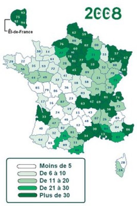 Angka menunjukkan peratusan penduduk muslim di Perancis pada tahun 1985 , 2006 dan 2008