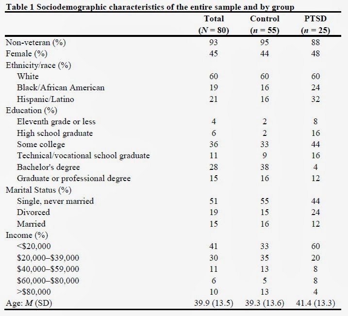 Table 1 presents the sociodemographic characteristics of the entire sample and by group. Participants were mainly non-veteran males and females with an average age of 39.9 years. Sixty percent of study participants self-identified as Caucasian, 21% reported being Hispanic or Latino, and 19% self-identified as Black or African American. Approximately 51% were single and never married, 43% had a college degree or higher, and 44% reported a yearly income of $30,000 or higher. PTSD (n = 25) and control (n = 55) groups did not differ across veteran status, gender, ethnicity, marital status, income, or age. Participants in the PTSD group, however, had significantly lower education levels (χ2 (6, N = 80) = 19.24, p = 0.004).