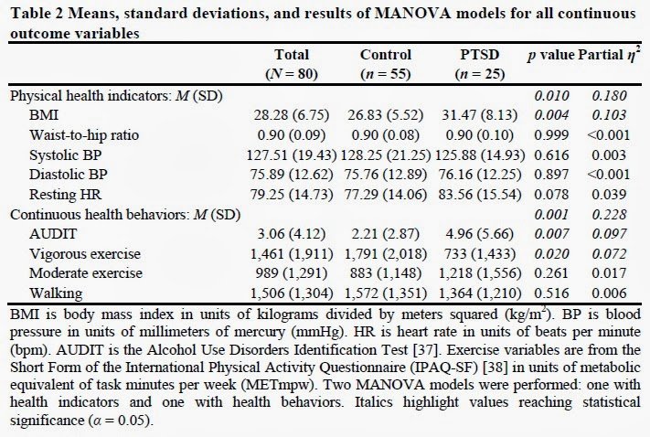 The open access study presented below, via the Annals of General Psychiatry, takes a look at the correlations between PTSD and poor health habits, including exercise (lack of), nutrition (more alcohol and fewer vegetables), and BMI (considerably higher).