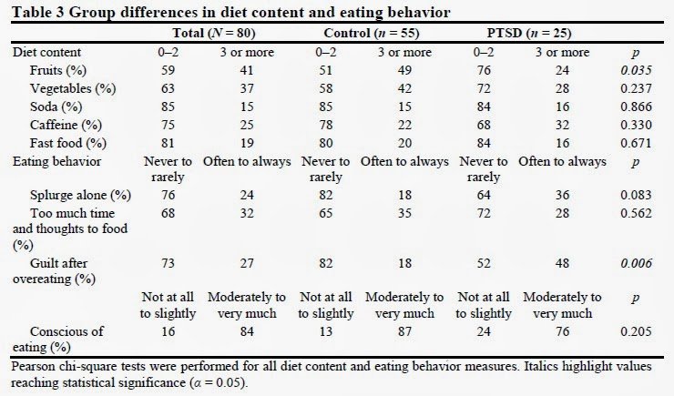 Based on a structured psychiatric interview, 25 participants had PTSD, and the remaining 55 without PTSD served as the comparison group. Participants were 40 years old on average and 45% were female. Multivariate analysis of variance analyses revealed that participants with PTSD had significantly higher body mass index (p = 0.004), had more alcohol use (p = 0.007), and reported fewer minutes of vigorous exercise (p = 0.020) than those without PTSD. Chi-square analysis of diet content and eating behavior constructs found that individuals with PTSD ate fewer fruits (p = 0.035) and had more guilt after overeating (p = 0.006).