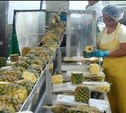 Kemudian buah-buah nanas tersebut akan di salurkan pula ke �Slicing Machine� dan �Resizing Machine� untuk tujuan ianya menghasilkan pelbagai bentuk dan saiz potongan. Proses seterusnya adalah pengisian nanas dan pengsirapan dimana ia menjamin buah nanas akan tetap enak. Ia dilakukan dimana potongan buah nanas dimasukkan kedalam tin dan ianya kemudiana di bawa ke mesin sirap (Sila lihat foto disebelah). Larutan sirap dengan pekatan gula yang telah ditetapkan disediakan berasingan dan diisikan kedalam tin yang berisi dengan kepingan nanas dengan menggunakan �syruping mechine�. Penyahudaraan (Exhausting) adalah proses yang mesti dilakukan selepas pensirapan. Lazimnya tin yang berisi kepingan nanas dilalukan ke dalam �exhausting box� untuk membuang udara yang terperangkap pada suhu 70 – 80 darjah Celcius untuk selama 7-10 minit iaitu ia bergantung kepada saiz tin yang digunakan. Ini adalah bertujuan bagi proses yang mewujudkan suatu keadaan vakum (Hampagas dalam tin). Bagi tujuan tersebut proses menutup tin perlu agar dilakukan dengan kemas. Proses pengkeliman dilakukan selepas melalui ‘exhausting box’ tin-tin berkenaan akan melalui �seaming machine� dan ditutup secara ‘harmetically seal’ (kedap udara). Kemudian dibuat pensterilan tin-tin yang bertutup kemudiannya di dalam �Sterillization Machine� pada suhu 105 darjah Celcius selama 30 minit. Kemudian tin kaleng ini melalui proses penyejukan dan pengeringan diman semua tin-tin yang telah disterilkan akan melalui mesin penyejukan pada suhu sekitar 40 – 44 darjah Celcius dimana ia kemudiannya dikeringkan menggunakan �blower�. Akhirnya adalah proses penyimpanan produk yang telah siap disusun di atas pallet akan disimpan selama dua (2) minggu untuk memastikan tahap kestabilan produk tersebut serta bebas daripada kontiminasi oleh mikroorganisma semasa melalui pemprosesan dan pengendalian.