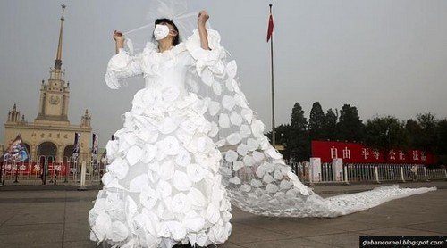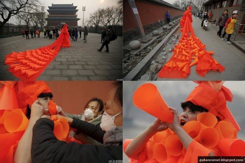 Sebagai bentuk bantahan dia pun mengenakan sebuah gaun pengantin yang diperbuat daripada megaphone. Dia berkeliling kota mengenakan pakaian yang dibuat dari puluhan megaphone plastik untuk menyuarakan mesej secara simbolik.