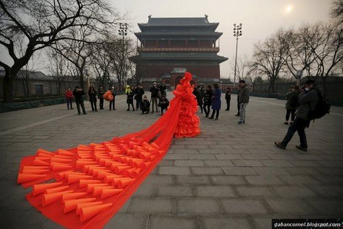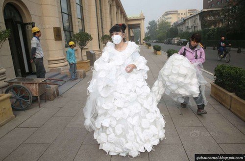 Ini bukan pertama kalinya Kong melakukan protes menggunakan pakaian. Tahun lalu, dia juga membuat sebuah gaun pengantin dengan menggunakan 1000 topeng muka untuk melakukan protes.