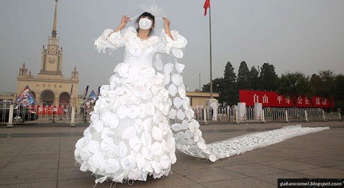 Ini bukan pertama kalinya Kong melakukan protes menggunakan pakaian. Tahun lalu, dia juga membuat sebuah gaun pengantin dengan menggunakan 1000 topeng muka untuk melakukan protes.