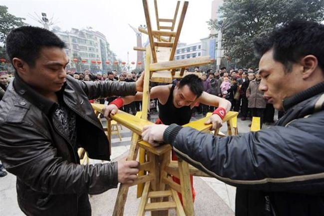 Senin (20/02/2012) kemarin, seorang pria berusia 30 tahun dari Cina, Li Hongxiao berhasil memecahkan rekor menjunjung 23 bangku dengan giginya.