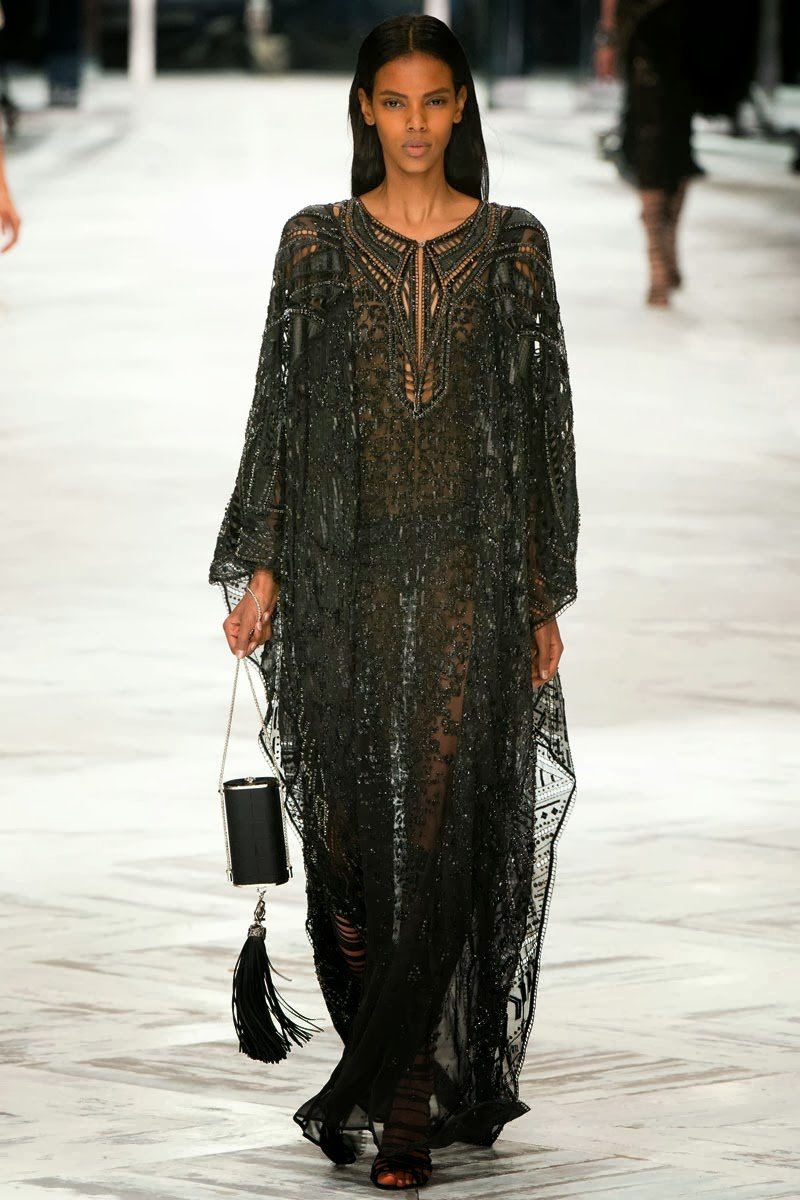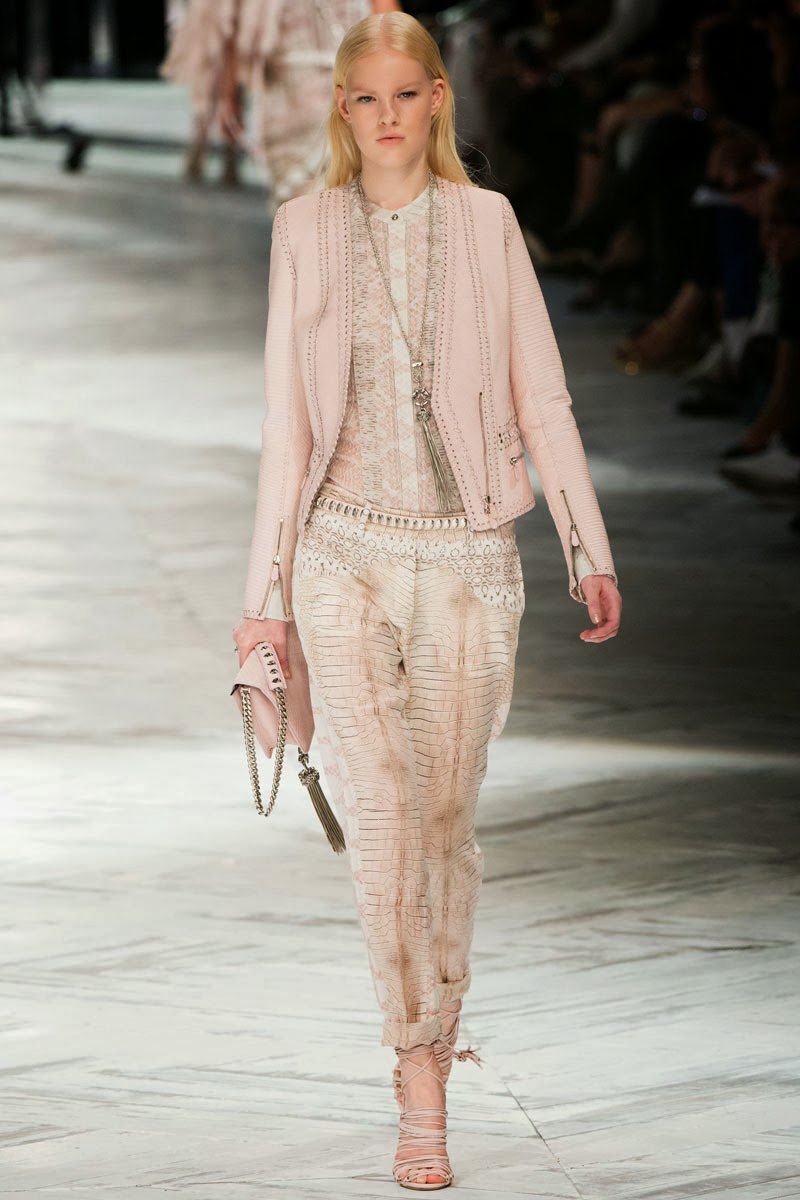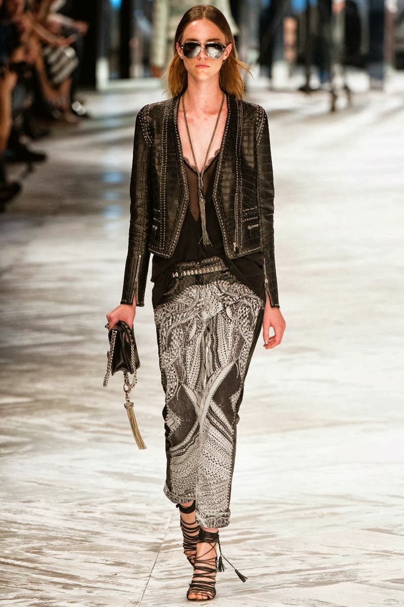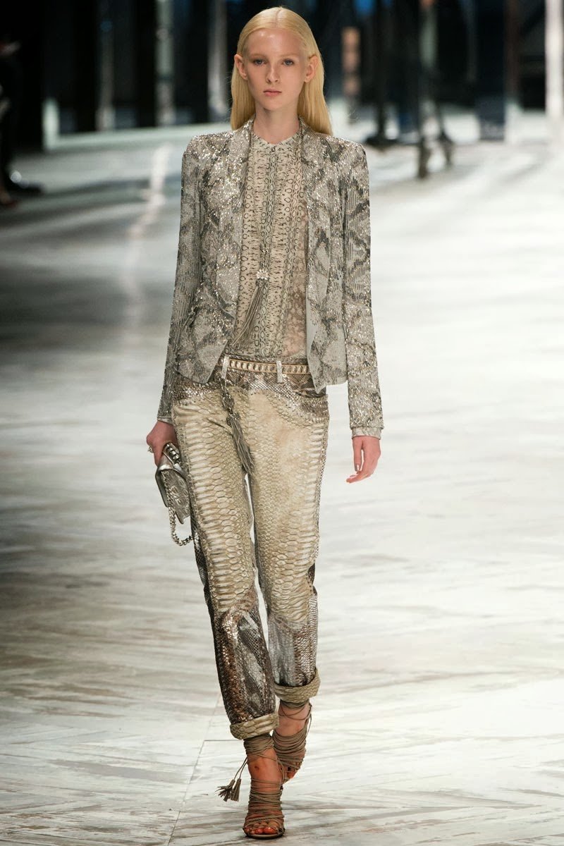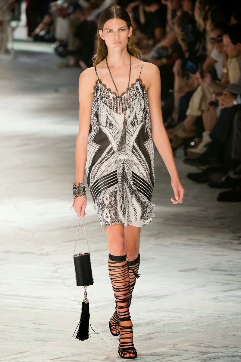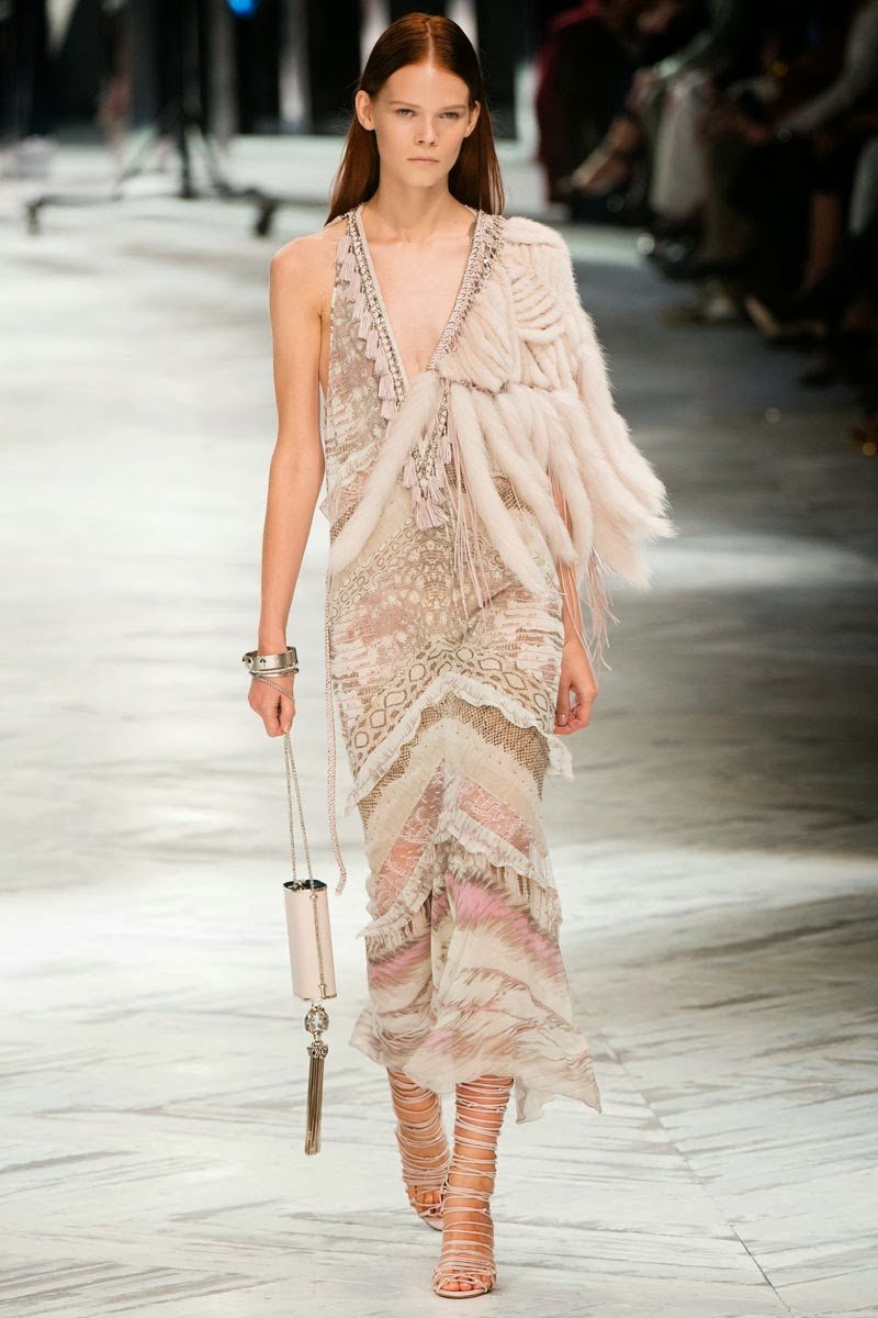Old Hollywood glamour inspired the Roberto Cavalli Spring/Summer 2014 Milan Fashion Week show. The Italian designer offered romantic and sexy silhouettes in a vivid colour palette of sparkling silver, pastel green and pastel pink, and the signature black. Models walked down the runway in heavily embellished floor length gowns with plunging necklines. Lace adorned the chiffon dresses and the models also draped themselves in sequinned jackets and fur wraps. The Roberto Cavalli woman wore her hair sleek with minimal make up, and paired up the elegant outfits with gladiator sandals, long necklaces with crystal pendants, clutches with hanging tassels, and chunky metallic bracelets.