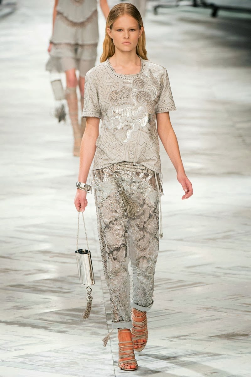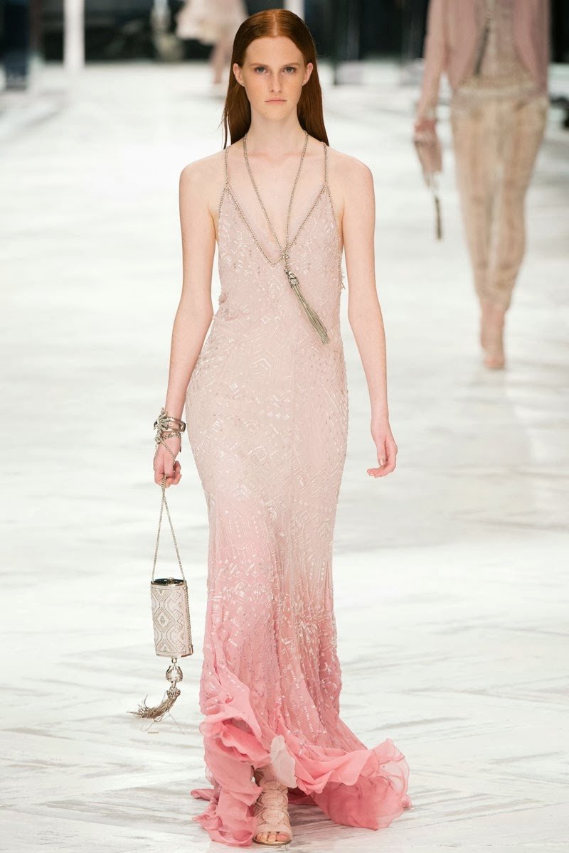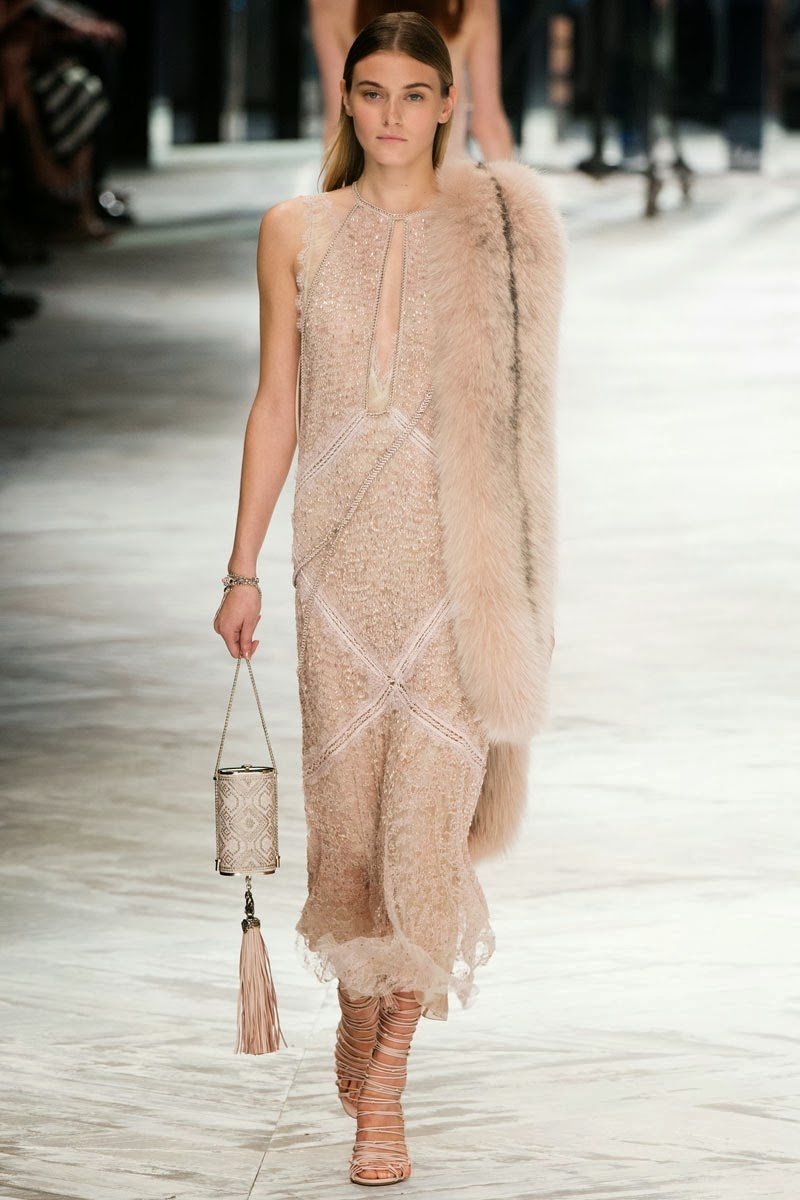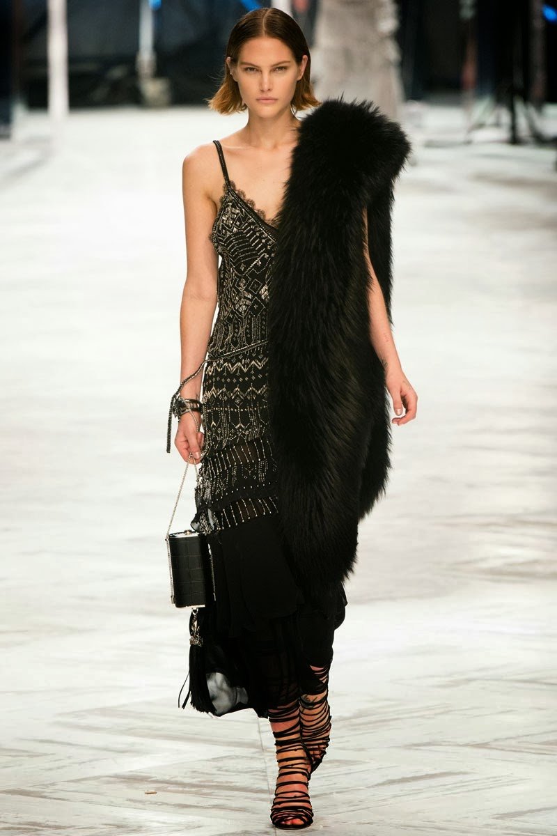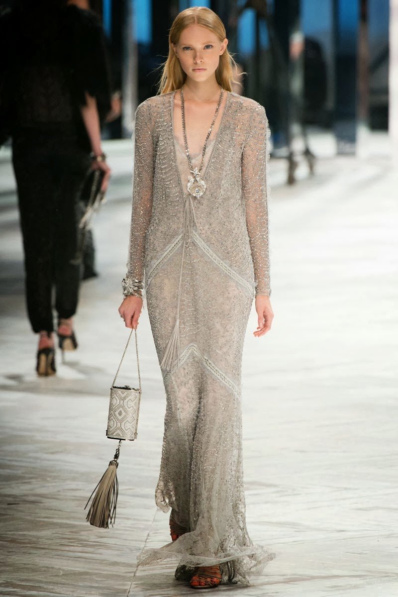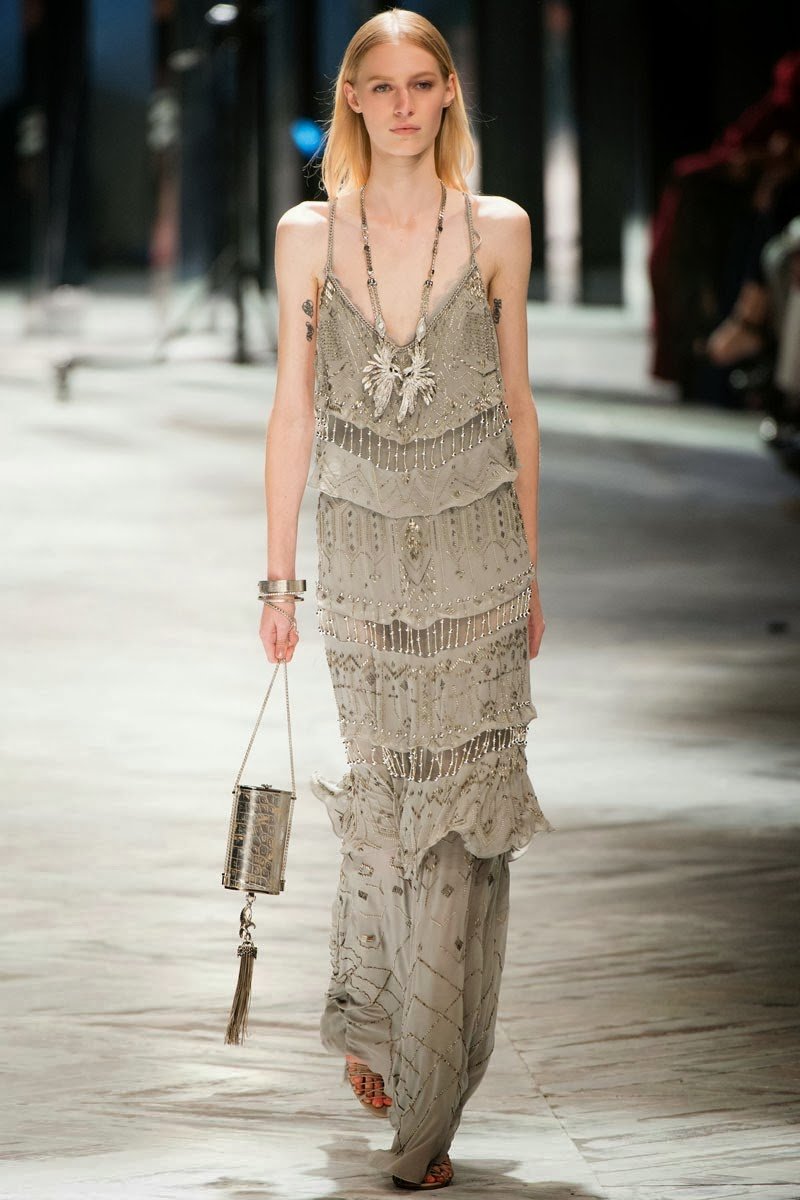 Old Hollywood glamour inspired the Roberto Cavalli Spring/Summer 2014 Milan Fashion Week show. The Italian designer offered romantic and sexy silhouettes in a vivid colour palette of sparkling silver, pastel green and pastel pink, and the signature black. Models walked down the runway in heavily embellished floor length gowns with plunging necklines. Lace adorned the chiffon dresses and the models also draped themselves in sequinned jackets and fur wraps. The Roberto Cavalli woman wore her hair sleek with minimal make up, and paired up the elegant outfits with gladiator sandals, long necklaces with crystal pendants, clutches with hanging tassels, and chunky metallic bracelets.