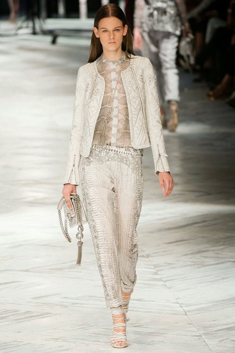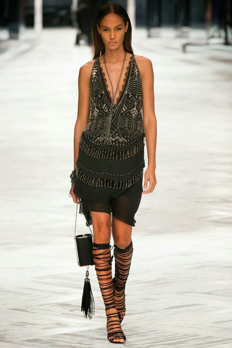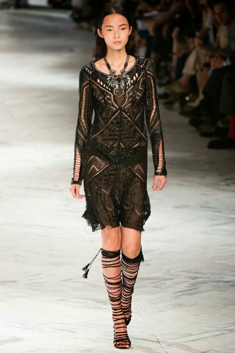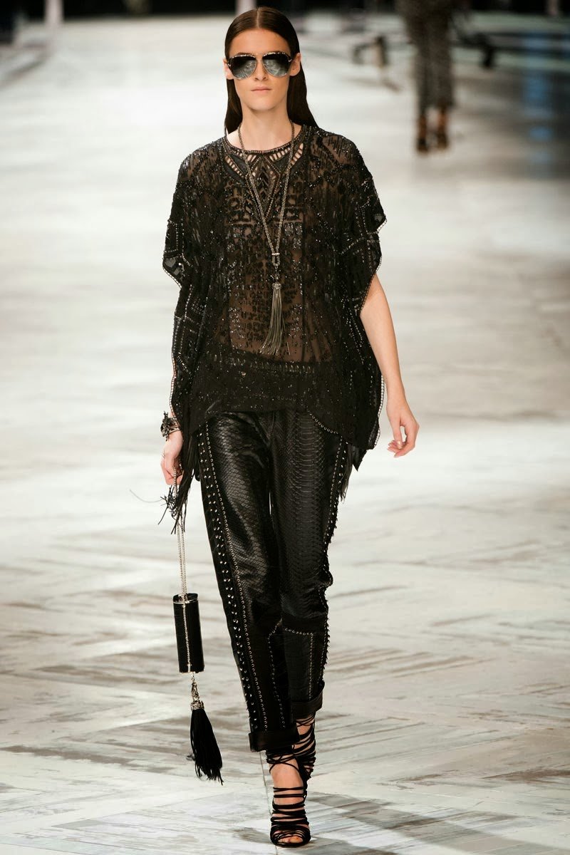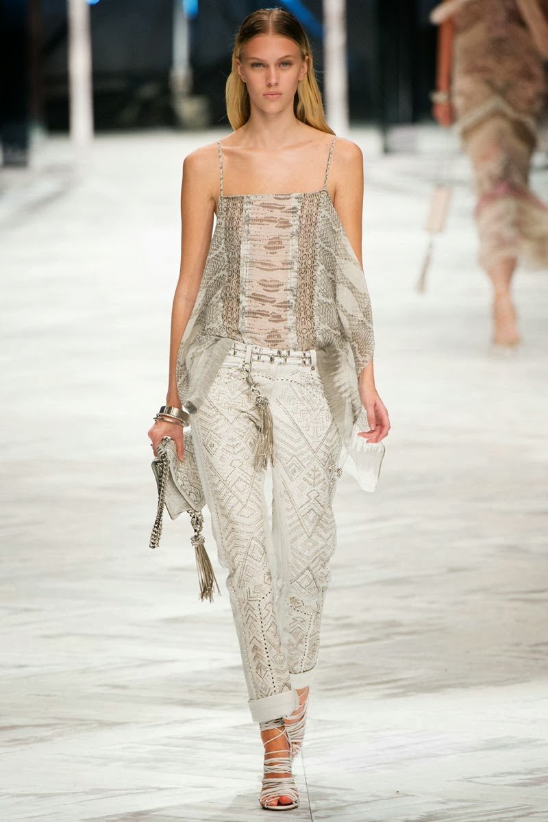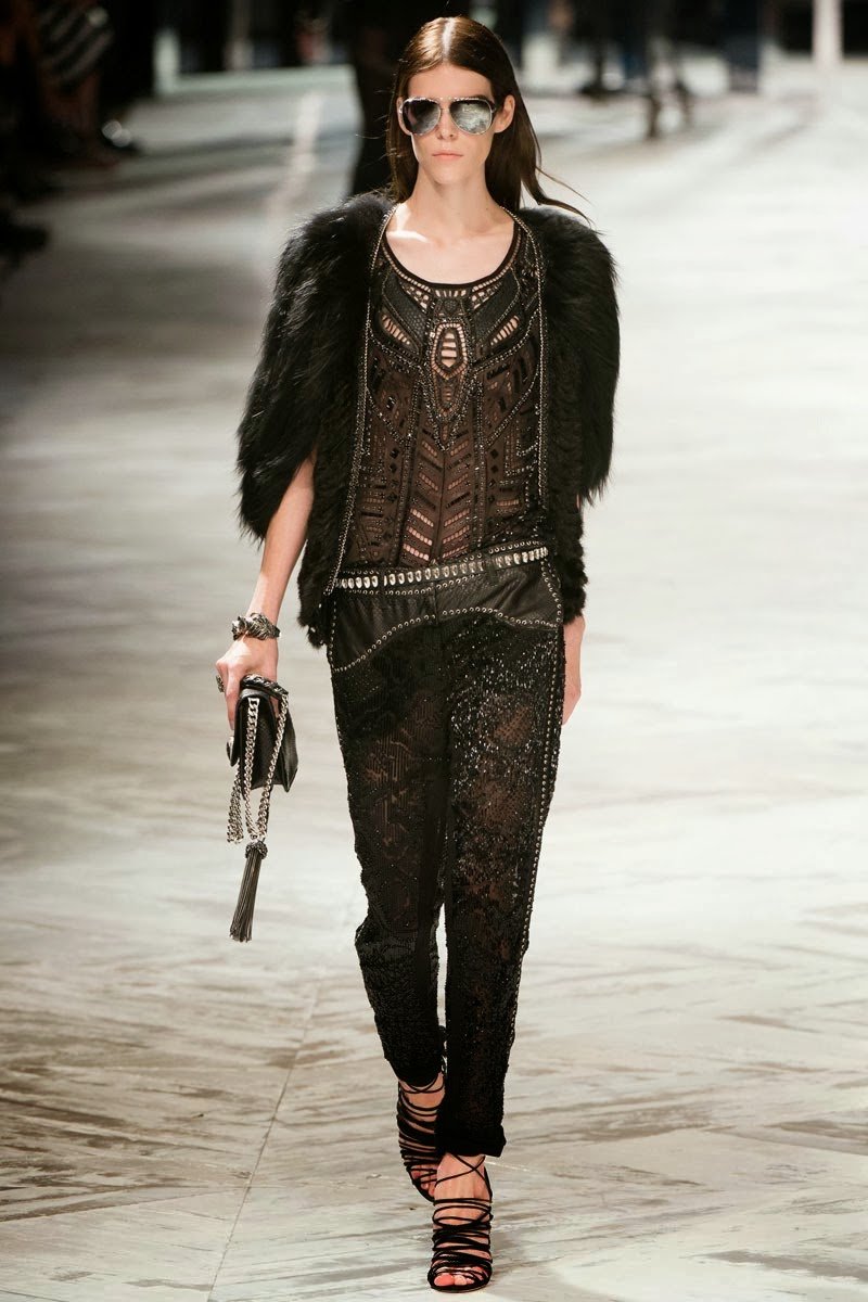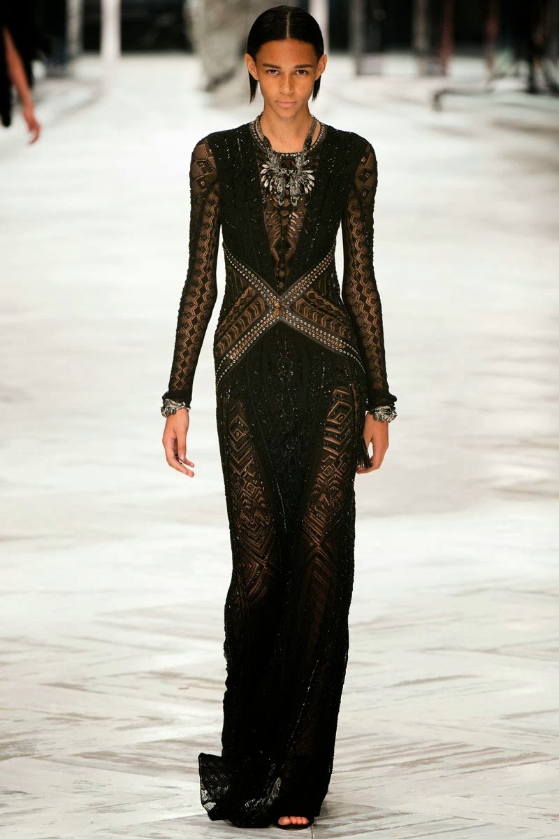 Old Hollywood glamour inspired the Roberto Cavalli Spring/Summer 2014 Milan Fashion Week show. The Italian designer offered romantic and sexy silhouettes in a vivid colour palette of sparkling silver, pastel green and pastel pink, and the signature black. Models walked down the runway in heavily embellished floor length gowns with plunging necklines. Lace adorned the chiffon dresses and the models also draped themselves in sequinned jackets and fur wraps. The Roberto Cavalli woman wore her hair sleek with minimal make up, and paired up the elegant outfits with gladiator sandals, long necklaces with crystal pendants, clutches with hanging tassels, and chunky metallic bracelets.