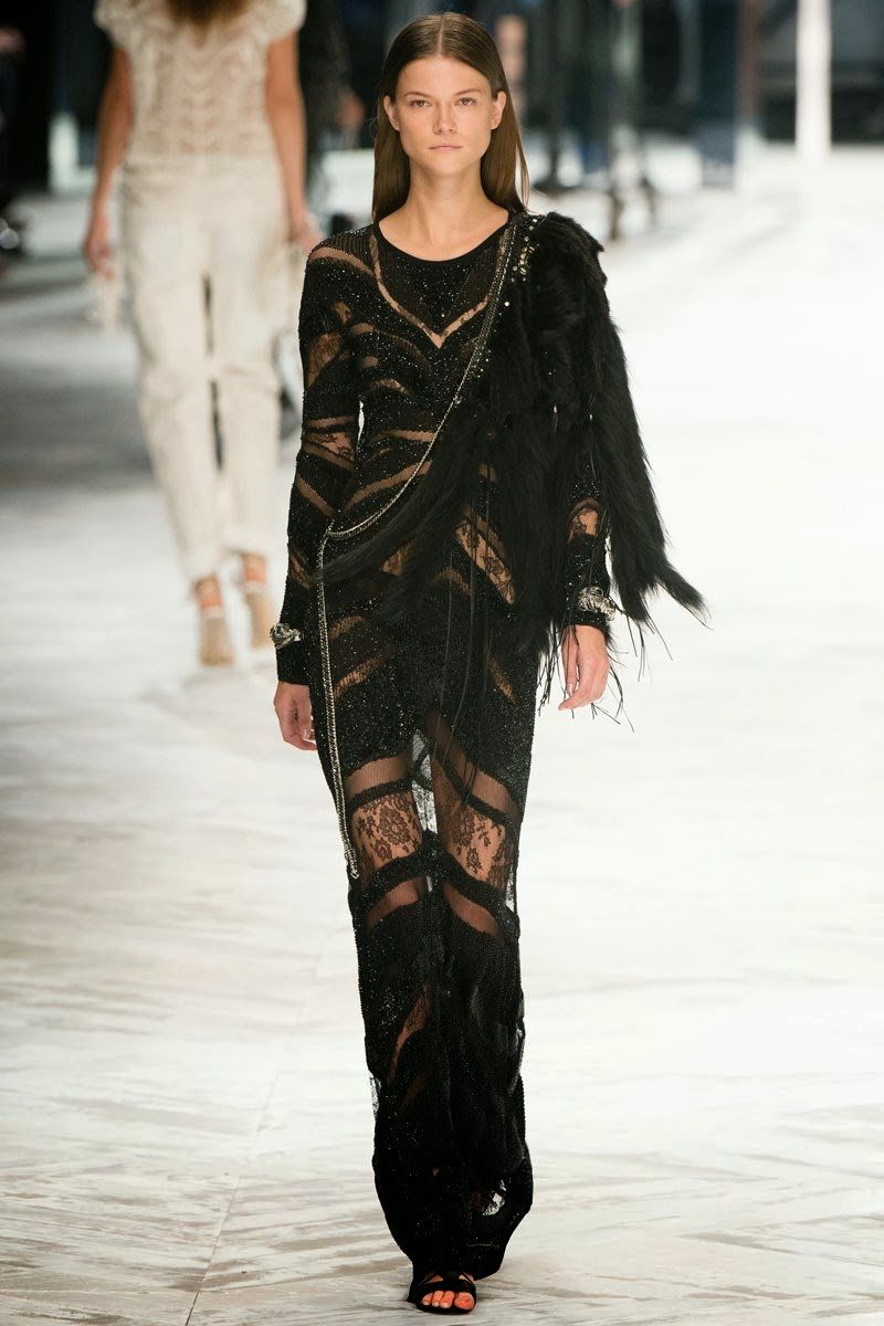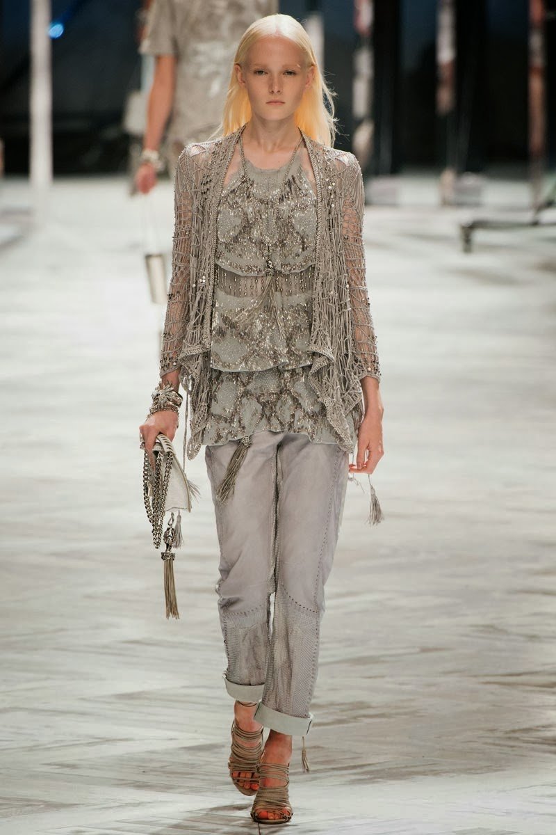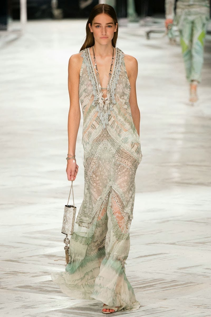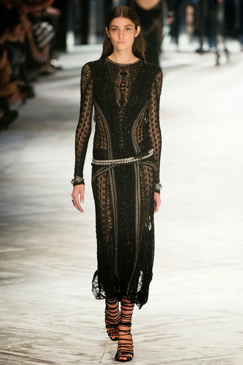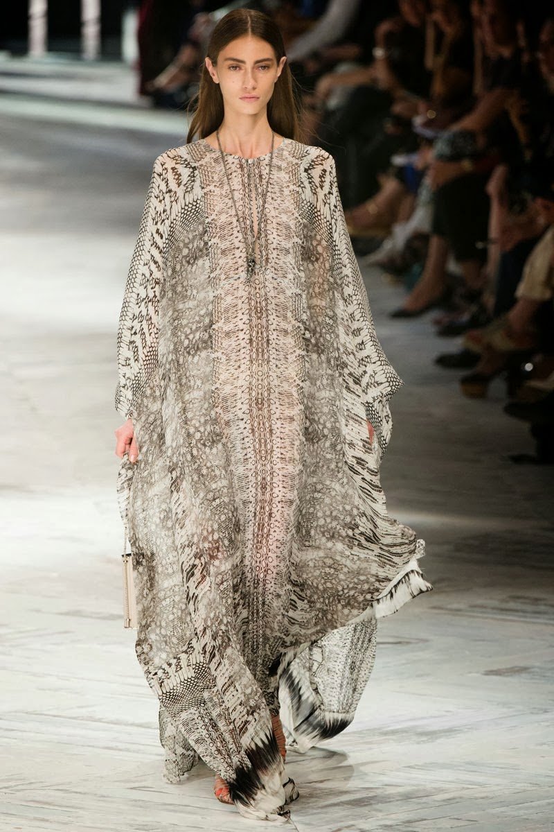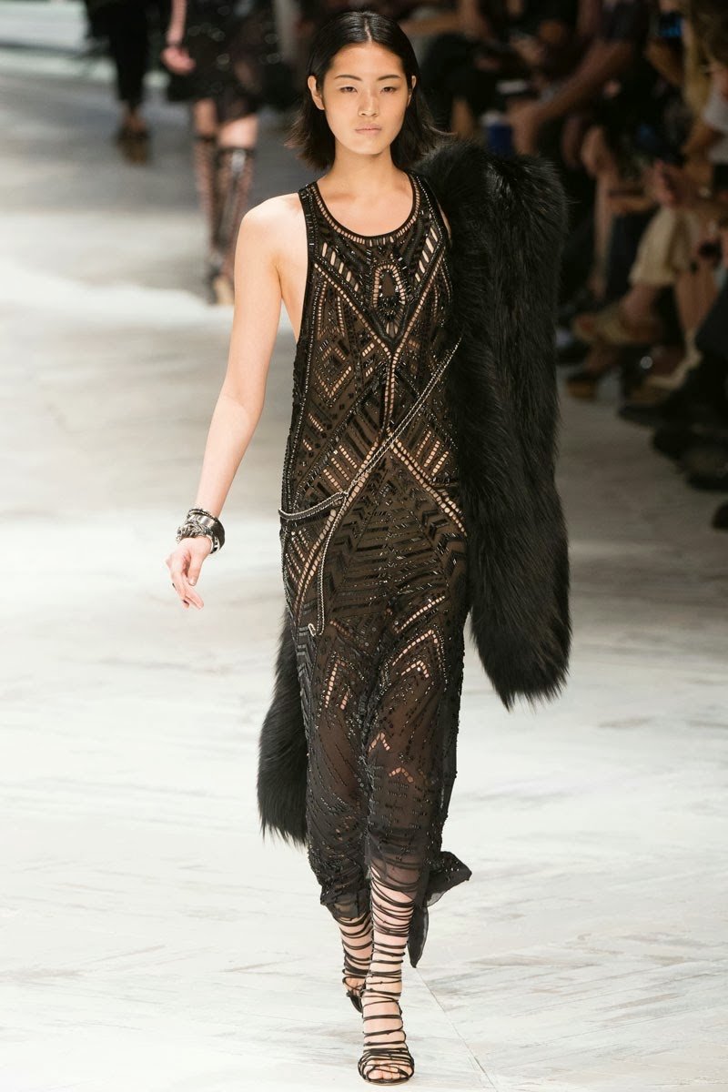 Old Hollywood glamour inspired the Roberto Cavalli Spring/Summer 2014 Milan Fashion Week show. The Italian designer offered romantic and sexy silhouettes in a vivid colour palette of sparkling silver, pastel green and pastel pink, and the signature black. Models walked down the runway in heavily embellished floor length gowns with plunging necklines. Lace adorned the chiffon dresses and the models also draped themselves in sequinned jackets and fur wraps. The Roberto Cavalli woman wore her hair sleek with minimal make up, and paired up the elegant outfits with gladiator sandals, long necklaces with crystal pendants, clutches with hanging tassels, and chunky metallic bracelets.