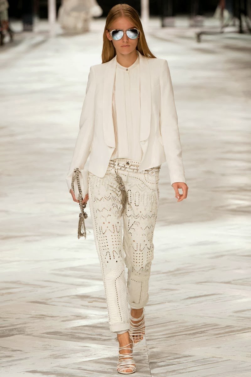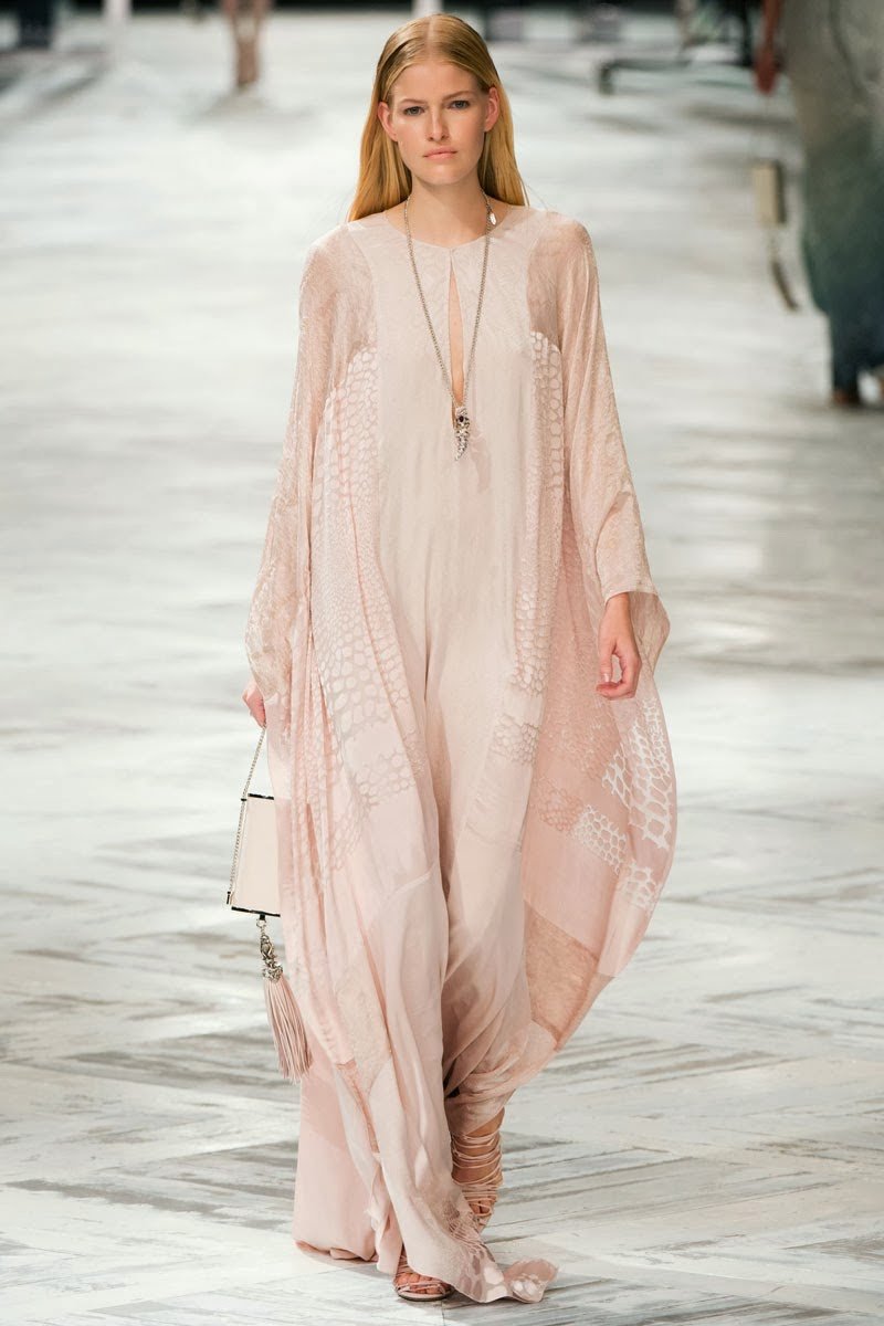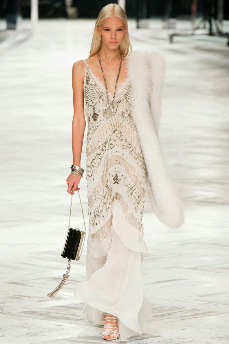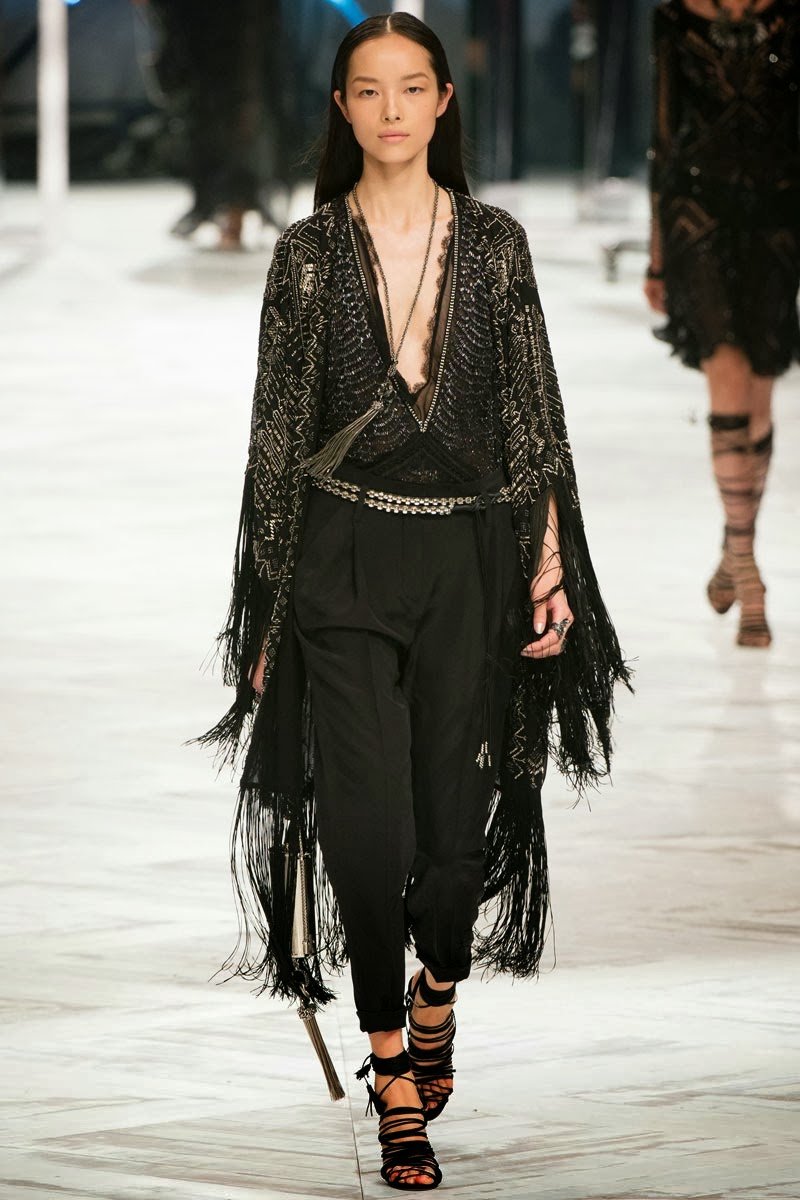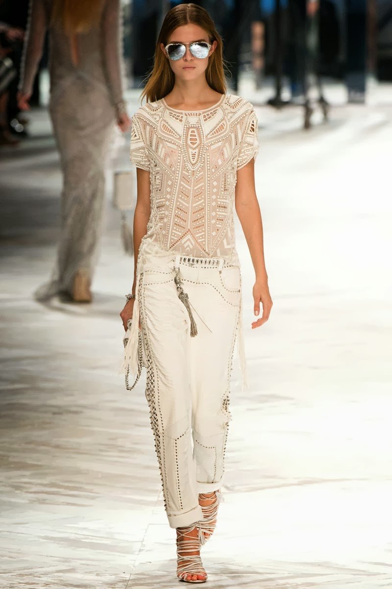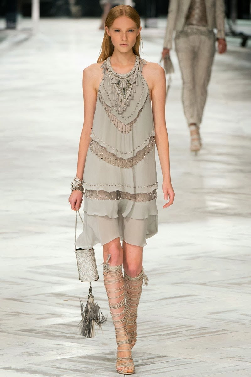 Old Hollywood glamour inspired the Roberto Cavalli Spring/Summer 2014 Milan Fashion Week show. The Italian designer offered romantic and sexy silhouettes in a vivid colour palette of sparkling silver, pastel green and pastel pink, and the signature black. Models walked down the runway in heavily embellished floor length gowns with plunging necklines. Lace adorned the chiffon dresses and the models also draped themselves in sequinned jackets and fur wraps. The Roberto Cavalli woman wore her hair sleek with minimal make up, and paired up the elegant outfits with gladiator sandals, long necklaces with crystal pendants, clutches with hanging tassels, and chunky metallic bracelets.