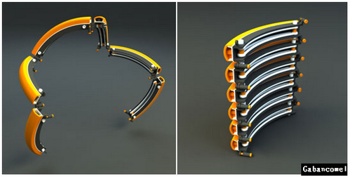 Struktur triangular basikal ganda dibina oleh modul yang dapat dipanjangkan. Masing-masing dilipat menjadi bentuk yang lebih kecil dan kemudian modul ini diselaraskan dengan putaran paksi dalam struktur sendinya. Agar tetap dalam kedudukan, semua struktur yang digunakan adalah bahagian khusus dalam bentuk dari X yang menyelaraskan semua modul pada kedudukan mereka.