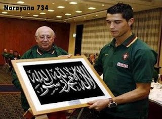 Narayana 734 – Foto bintang sepak bola Cristiano Ronaldo sedang memegang kaligrafi syahadat menghebohkan dunia maya, baru-baru ini. Di jejaring sosial, Ronaldo diposisikan mendukung Islam dan mengecam film Innocence of Muslims. Benarkah megabintang Real Madrid itu masuk Islam gara-gara film Innocence of Muslims?