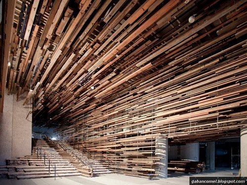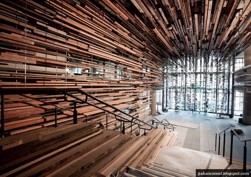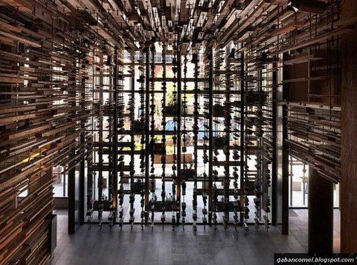 Pereka bentuk bangunan itu, March Studio berkata, pihaknya menggunakan kira-kira 5,000 kepingan kayu kitar semula untuk menghiasi pintu masuk lobi tersebut selain menjadikannya sebagai dinding, tangga dan perabot.