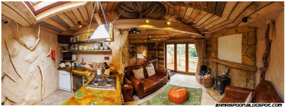 Perabot mewah indah dan berkualiti menjadi tempat duduk. Tab mandi air panas yang berada di ketinggian. Seluruh interior dari pembinaan terletak 6 meter di atas tanah pada pohon merah cedar setinggi 7.6 meter itu menjadi rumah pohon paling deluxe yang dihuni di eropah.