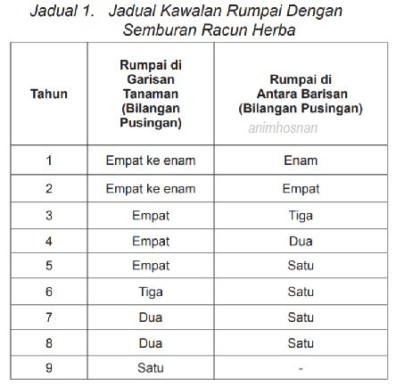 Penggunaan racun rumpai (weedicide) perlu diminimumkan seperti. Jika sekiranya lebih daripada satu bahan kimia digunakan sebaiknya ianya perlu dilarutkan satu persatu untuk mengelak terjadinya pemendakkan. Campuran hendaklah selalu dikacau dan kemudiannya ditapis ketika dipindahkan ke dalam pam sandang. Untuk mendapatkan keputusan yang baik dimana penyemburan sepatutnya dilakukan pada awal pagi atau lewat petang untuk mengelakkan peruapan campuran kimia semburan. Kesan semburan ke atas rumpai adalah selama dua hingga tiga bulan mengikut keadaan naungan. Walau bagaimana pun aktiviti penyemburan semula hanya dilakukan apabila kadar pertumbuhan rumpai mencapai 60 peratus. Apabila terdapat hanya sejenis rumpai yang tumbuh di ladang, gunakan jenis racun rumpai yang berkesan untuknya dan elak menggunakan campuran racun rumpai biasa. Jika gunakan alatan semburan seperti alat penyembur galas perlu diperiksa dahulu (Sila lihat foto disebelah). Alat penyembur jenis galas selalunya diperbuat daripada tembaga, keluli atau plastik. Jenis nozel juga ada berbagai jenis nozel iaitu jenis kipas, kon dan pembias dengan berbagai saiz. Nozel jenis kipas atau pembias sesuai untuk meracun di lorong pokok getah dan nozel jenis kon untuk tujuan semburan rumpai berkelompok atau setempat. Alat Penyembur Racun dan Jenis Nozel perlu diketahui kerana kadang kala, kekerapan menggunakan sesuatu jenis racun rumpai untuk jenis rumpai tertentu mungkin menyebabkan pengumpulan sesuatu spesis yang rentan kepada racun tersebut. Pemerhatian ke atas perkara ini perlu diteliti untuk mengelakkan pembaziran. Lazimnya antara faktor-Faktor yang mempengaruhi akan keberkesanan penyemburan bergantung kepada alat penyembur dan nozel yang bersesuaian dan dalam keadaan baik serta kadar tekanan pam yang sesuai. Kepantasan seseorang berjalan dan kadar kerataan penyemburan racun rumpai serta kadar isipadu air yang diperlukan adalah kira-kira 450 liter sehektar keseluruhannya jika menggunakan nozel 5/64 inci. Beberapa langkah keselamatan bagi mereka gunakan racun rumpai dengan menyimpan racun di tempat berkunci dan jauh daripada bahan makanan dan kanak -kanak. Sebaiknya membaca label dengan teliti sebelum mengguna- kan racun dan juga menggunakan pakaian dan peralatan pelindung apabila menyedia dan menyembur racun. Pastikan alat penyembur berkeadaan baik. Jangan menyembur racun bertentangan dengan angin dan juga jika nozel tersumbat, basuh dengan air dan gunakan anak mancis atau ranting kecil 14 yang ditajamkan dan jangan ditiup atau menggunakan dawai. Pastikan jangan merokok, makan atau minum semasa meracun dan apabila racun terkena kulit, basuh segera dengan air bersih. Jika racun terkena pakaian, tanggalkan pakaian berkenaan dan cuci bahagian badan yang terkena racun serta cuci pakaian tersebut dengan segera hingga bersih. Jika racun terkena mata, cuci segera dengan air bersih sekurang-kurangnya lima belas minit. Pastikan bekas racun yang tidak dipakai lagi hendaklah dibasuh tiga kali dan dirosakkan sebelum ditanam di tempat yang sesuai. Sila berjumpa doktor jika berasa tidak sihat. Semuga artikel diatas memberi info berguna kepa pembaca anim agro technology kali ini. Wasallam!!!…