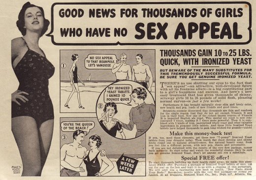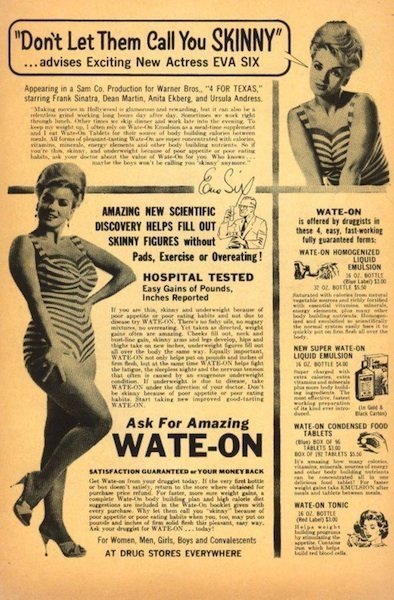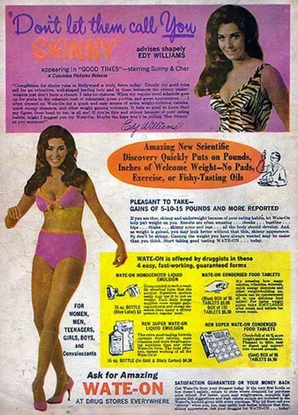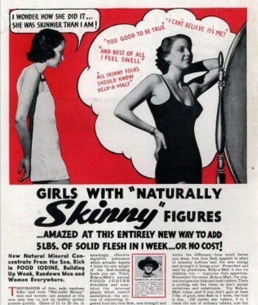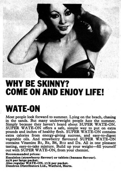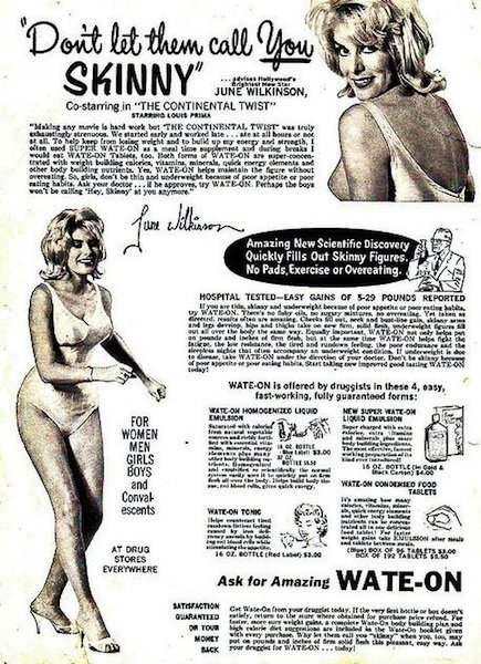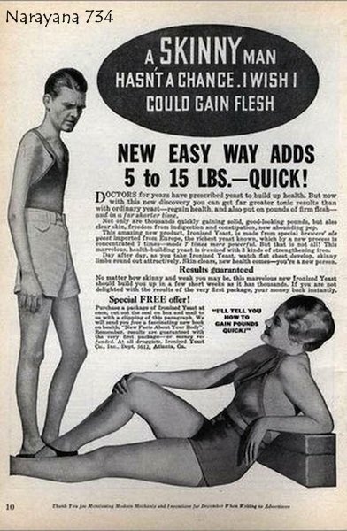 Narayana 734 – Sekarang mungkin seluruh wanita ingin terlihat lebih kurus. Penjualan makanan diet dan segala trik untuk terlihat lebih langsing pun selalu laris diburu. Padahal puluhan tahun lalu, yang terjadi justru sebaliknya. Wanita berlomba-lomba mendapatkan tubuh gemuk dan montok, karena kurus dianggap tak menarik. Terbukti dari sejumlah iklan “jadul” berikut ini.