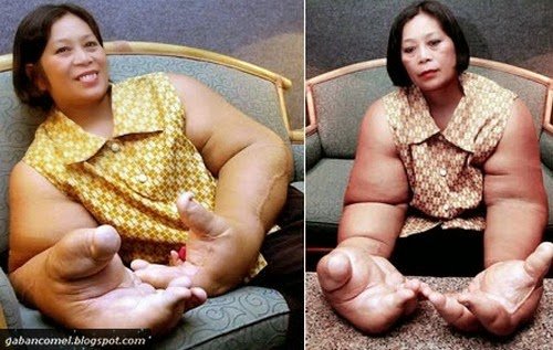 Akhbar Daily Mail melaporkan, Duangjay Samaksamam, 59, dari wilayah Surin, Thailand dipercayai memiliki tangan paling besar di dunia seberat 9.5 kilogram setiap satu, menderita penyakit yang jarang-jarang berlaku, selain menyebabkan anggota badannya membengkak.