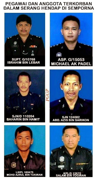 “Kesan kelaran terdapat pada kepala dan badan Sarjan Abdul Aziz Sakiran dan Superintenden Ibrahim Lebar, manakala ASP Michael Padel mengalami kecederaan pada bahu dan dada, katanya.