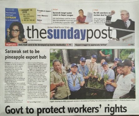 INDUSTRI NANAS Sarawak sebagai sumber kekayaan baru bakal menjadi kenyataan apabila ianya dilaksanakan secara berperingkat dimasa akan datang. Perkara ini dinyatakan oleh Timbalan Ketua Menteri Sarawak di Kg Padang Pan, Bau, Sarawak pada 13 Januari 2018 dalam satu majlis rasmi pelancaran penanaman nanas MD2 pada peringkat Negeri Sarawak. Beliau berkata penanaman nanas MD2 bakal menjana pendapatan lumayan kepada pengusaha nanas di Sarawak dengan kerjasama lembaga Perindustrian Nanas Malaysia (LPNM). Dakwanya sebelum ini penanaman nanas di Sarawak hanya untuk makan sendiri sahaja dan tidak dipasarkan dengan cara betul menyebabkan harganya rendah. Petani dan penanam nanas di Sarawak telah beratus tahun menanam nanas sebagai satu aktiviti pertanian tetapi hanya untuk saradiri dan kini diperkenalkan varieti baru yang premium kualitinya untuk pasaran domestik dan pasaran eksport. Nanas MD2 kini diterima dipasaran antarabangsa dan pasaran domestik kerana kuaitinya yang manis, tahan lama dan mendapat permintaan baik diseluruh dunia. Ia selaras dengan konsep pembangunan dibawah perindustrian 4.0 yang diwar-warkan oleh Ketua menteri Sarawak sempena setahun beliau menjadi Ketua Menteri Sarawak. LPNM memperuntukkan sebanyak RM6.5 juta pada tahun 2018 untuk pembangunan nanas di Sarawak bagi tujuan menentukan industri ini lebih maju dimasa akan datang. Artikel kali ini dalam “Anim Agro Technology” dipaparkan laporan akhbar tempatan The sunday Borneo Post pada 14 Januari 2018 yang bertajuk “Sarawak set to be pineapple export hub” untuk dijadikan bahan bacaan dan rujukkan.