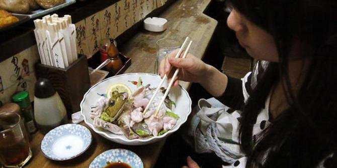 Narayana 734 – Ketika mendengar sashimi, kebanyakan orang akan berpikir tentang daging ikan. Namun, ada banyak variasi sashimi yang bisa dijumpai di Jepang, termasuk sashimi daging kuda dan ayam. Namun, kali ini ada yang berbeda, karena sashiminya ternyata dibuat dari daging katak raksasa.
