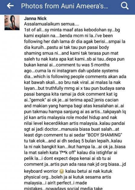 Sedar dirinya sedang hangat diperkatakan, Janna Nick tampil memohon maaf dan mengakui tidak bermaksud untuk menghina fizikal model berkenaan. Berikut komen Janna Nick.