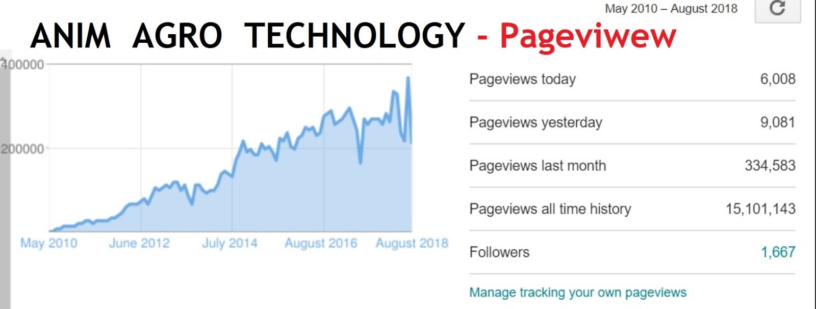 Blog Anim Agro Technology telah mencapai 15,101,143 (atau ringkasnya 15.1 juta) pengunjung semenjak ia diterbitkan 10 tahun lalu. Jumlah ini tidak termasuk bloggers lain yang buat terus link dengan membuat capaian terus dan memplagiat artikel-artikel dari penulisan blog ini. Kini jumlah yang membaca semakin ramai dengan 1,667 follower yang membuat rujukkan. Purata mereka yang ada membuat tinjauan blog ini diantara 9,000 – 15,000 orang dalam sehari bergantung kepada hari yang berlainan. Jika hari bekerja memang melabihi 12,000 orang sehari sebaliknya pada hari kelapasan am sekitar 9,000 orang sahaja (Sila rujuk rajah diatas). Artikel ini adalah artikel yang ke 4,846 dimana sebanyak 3,182 telah dibuat posting dan bakinya masih menunggu untuk dibuat posting. Setiap hari akan dibuat posting satu artikel tanpa tertinggal walau sehari pun semenjak lebih 10 tahun blog ini diterbitkan.
