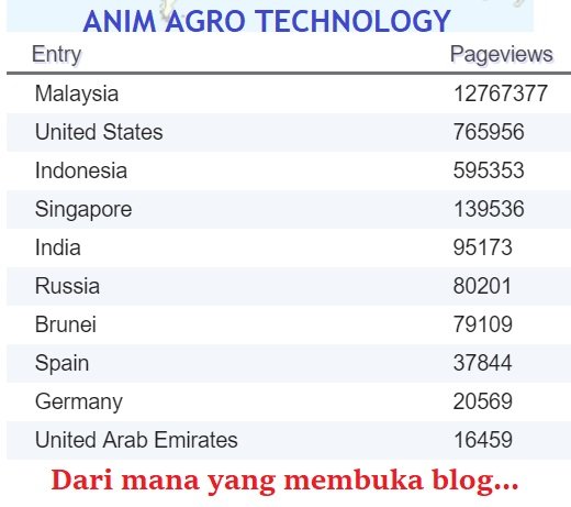 Pembaca dari Malaysi masih merupakan paling ramai yang membuat rujukkan (Sila lihat foto diatas). Seramai 12.76 juta rakyat Malaysia telah membuka dan membaca tulisan saya dalam Anim Agro Technology. Ini diikuti dengan rakyat dari USA seramai 765,956 orang yang mendudukki tempat kedua. Penulis blog dapati mereka akan gunakan “google translate” untuk membaca tulisan saya dengan mudah. Rakyat Indonesia menjadi ke tiga teramai membuat rujukkan dengan seramai 595,353 walau sebahagian mereka selalu merujuk kepada blog saya yang dibaca menggunakan url. disana sahaja. Ini diikuri dengan Singapura, India, Russia, Buriei, Sepanyol dan juga Jerman. Semuga tulisan saya etiap hari memberi info berguna kepada semua pembaca. Wasallam!!!…