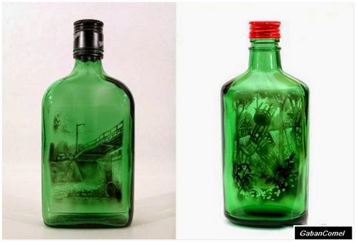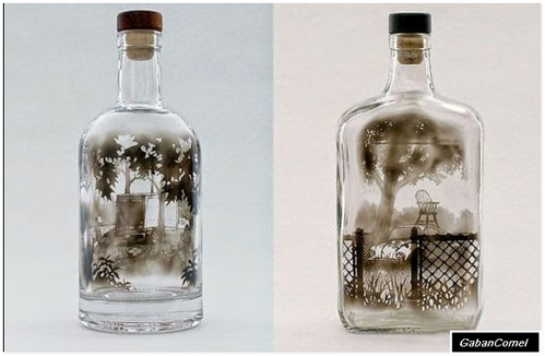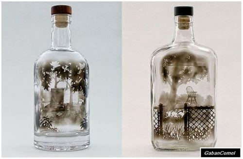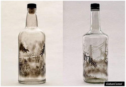 Jim Dingilian membuktikan bahawa seorang artis yang kreatif dan mahir boleh membuat karya seni dengan apa sahaja. Dengan melapisi bahagian dalam botol kaca kosong dengan asap hitam dan kemudian dengan berhati-hati memberus dengan alat yang dipasang pada dowels, dia mencipta karya seni asap terperinci dan cantik .