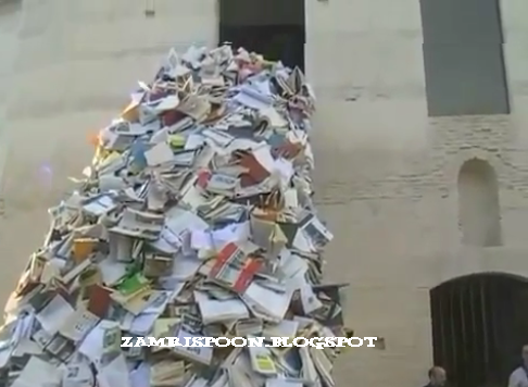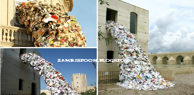 Ya, sebenarnya ini merupakan sebuah karya seni Alicia Martin yang menakjubkan. Ia membuat memuntah buku rekaan dari kumpulan buku-buku. Bahkan ia tidak hanya sekali membuatnya. Wanita ini membuat banyak lemparan dari buku seperti yang anda lihat berikut ini.